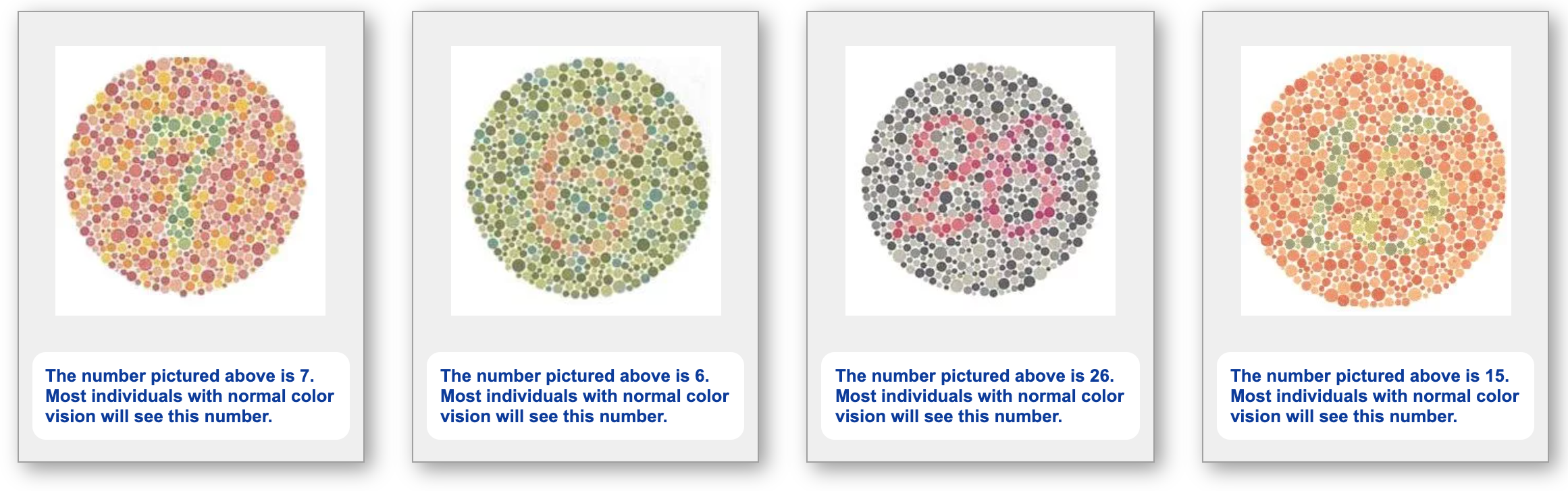 The colour test that you can find here is a way of testing the different types of colour blindness through using coloured dots. Someone who is colour blind will see all the dots as the same colour, or will mistakenly get the number wrong, whereas someone who isn’t colour blind should be able to spot the number in the dotted pattern.