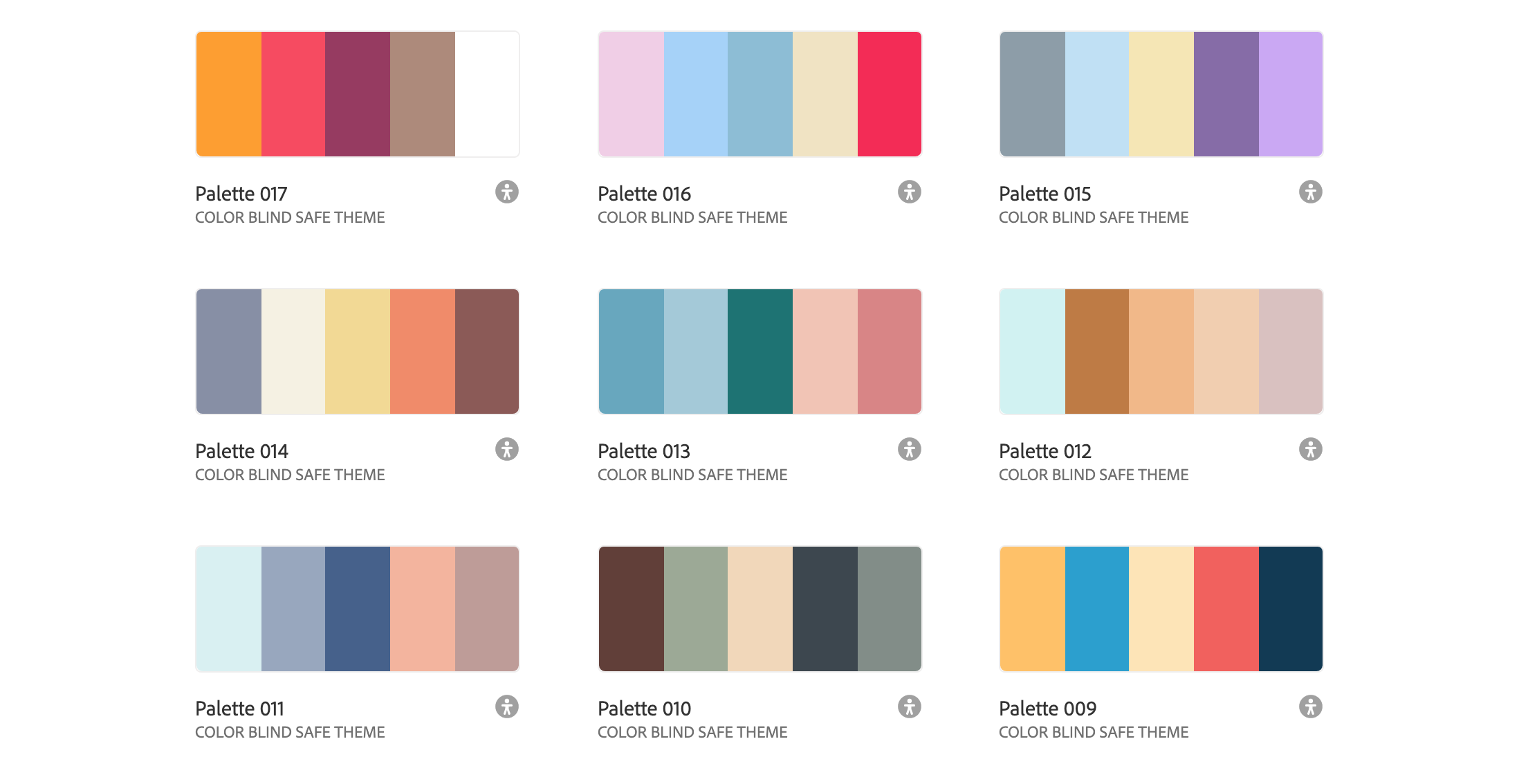As you can see from the small snippet below I created each of these themes with accessibility in mind. The icon in the bottom right of each palette means that it is a colour blind safe theme.