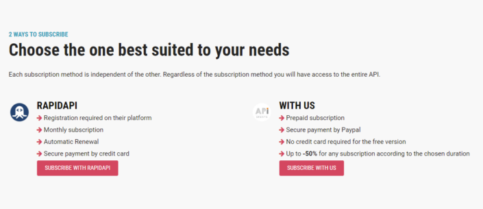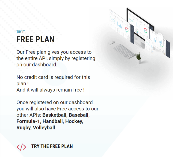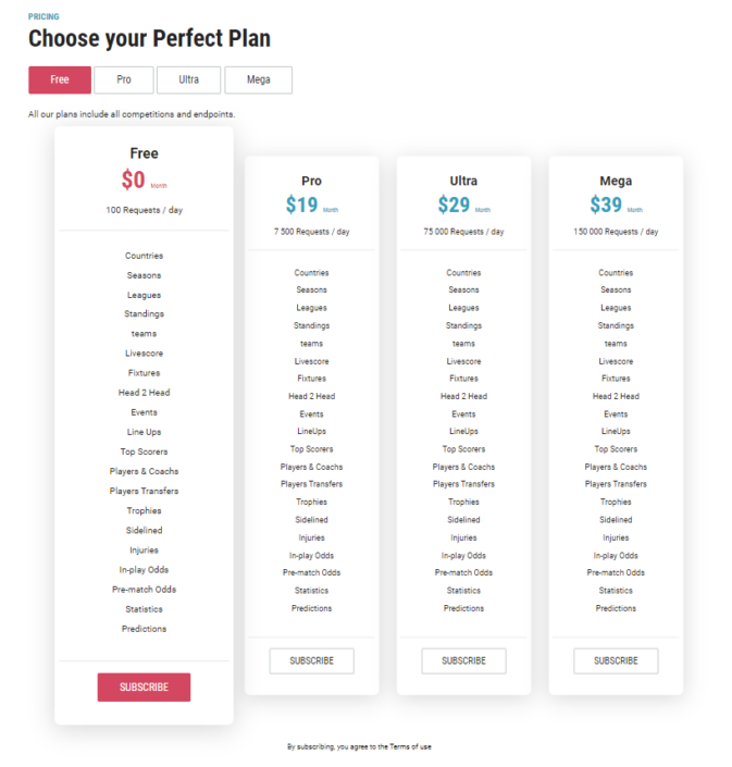 First of all, we need to set up our own API-Football account. To do so, we need to access the API-Football pricing section and choose SUBSCRIBE to the Free plan.