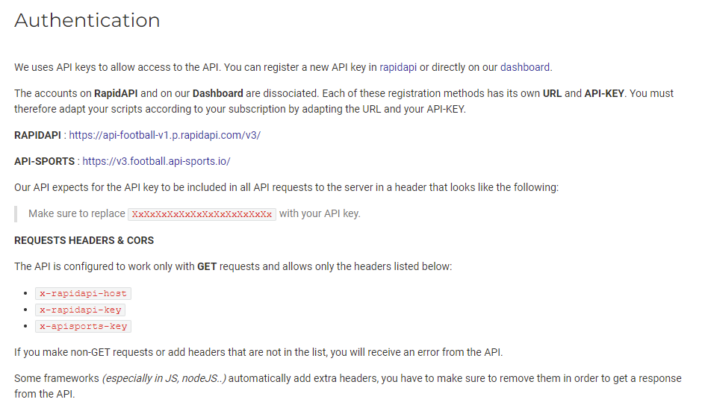 After we have just created our account and log into the API services to get our key, it is time to check which kind of calls we can make and how to make those. That information will be stored in the documentation web-page of the API-Football service which can be accessed here.