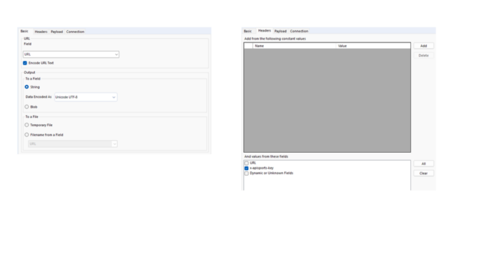 After these credentials have been brought into Alteryx, then it is required to make the API call. There is one specific tool to make it which is the Download Tool and it will require us to specify which is the URL of the query. It will also require us to select which field contains the key as that will be selected in the Headers tab of the Download Tool configuration.