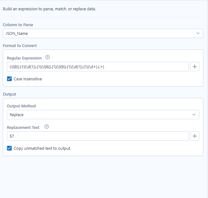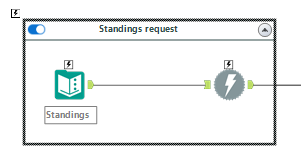 - RegEx Tool: Using RegEx here can be useful in order to rename those values that will serve as column names (or headers) for our final dataset. Once our download data is parsed using a JSON Parse Tool, the name for each will value will be under a colunm called JSON Name. That will contain some characters such as response.0.league.standings.0.0.team.id but we are interested only in the two final words of that name. That way we can use a RegEx to parse just that part of the name: