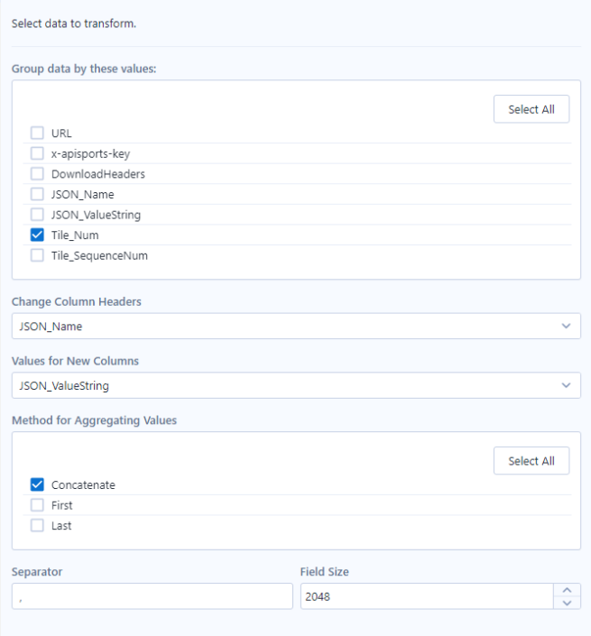 - Tile Tool: As our query contains data related to the standings for a specific league and season, then it will contain as many records as information it returns for every team of that specific league and season. For example, if we are downloading the data of the Premier League 2021/2022, we must consider that we will have 20 teams so we should use a Tile Method of Equal Records for a total of 20 tiles (which it really means teams for this use case). However, we must consider the number of teams in Tile Tool based on which competition we are querying its data.