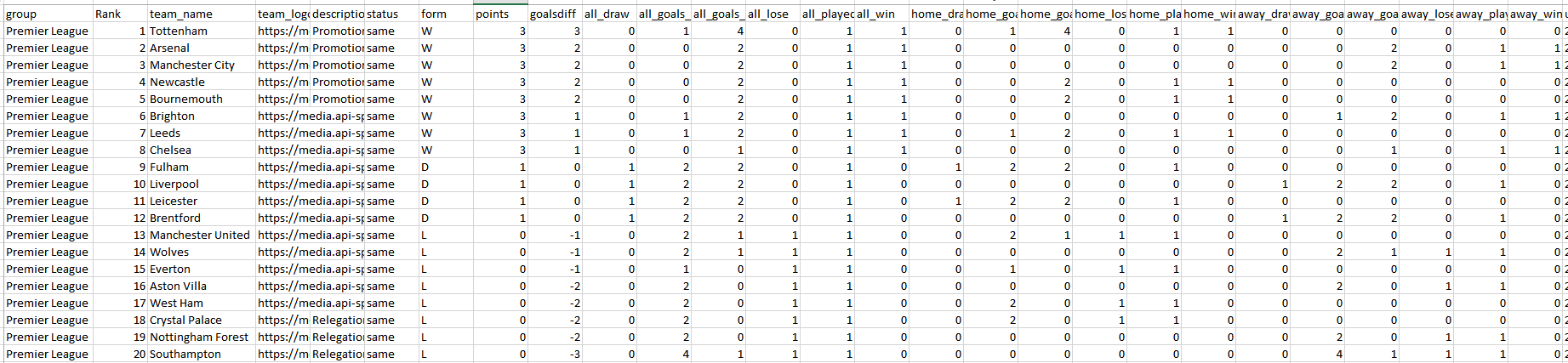 After a query just like this one, we would be able to get information related to the competition, a team name, id & logo, results due to its ranking (UCL,UEL, Relegation), status compared to previous week, games played (home & away), games won (home & away), games lost (home & away), games drawn (home & away), goals scored (home & away), goals against (home & away) and the latest date for a game.