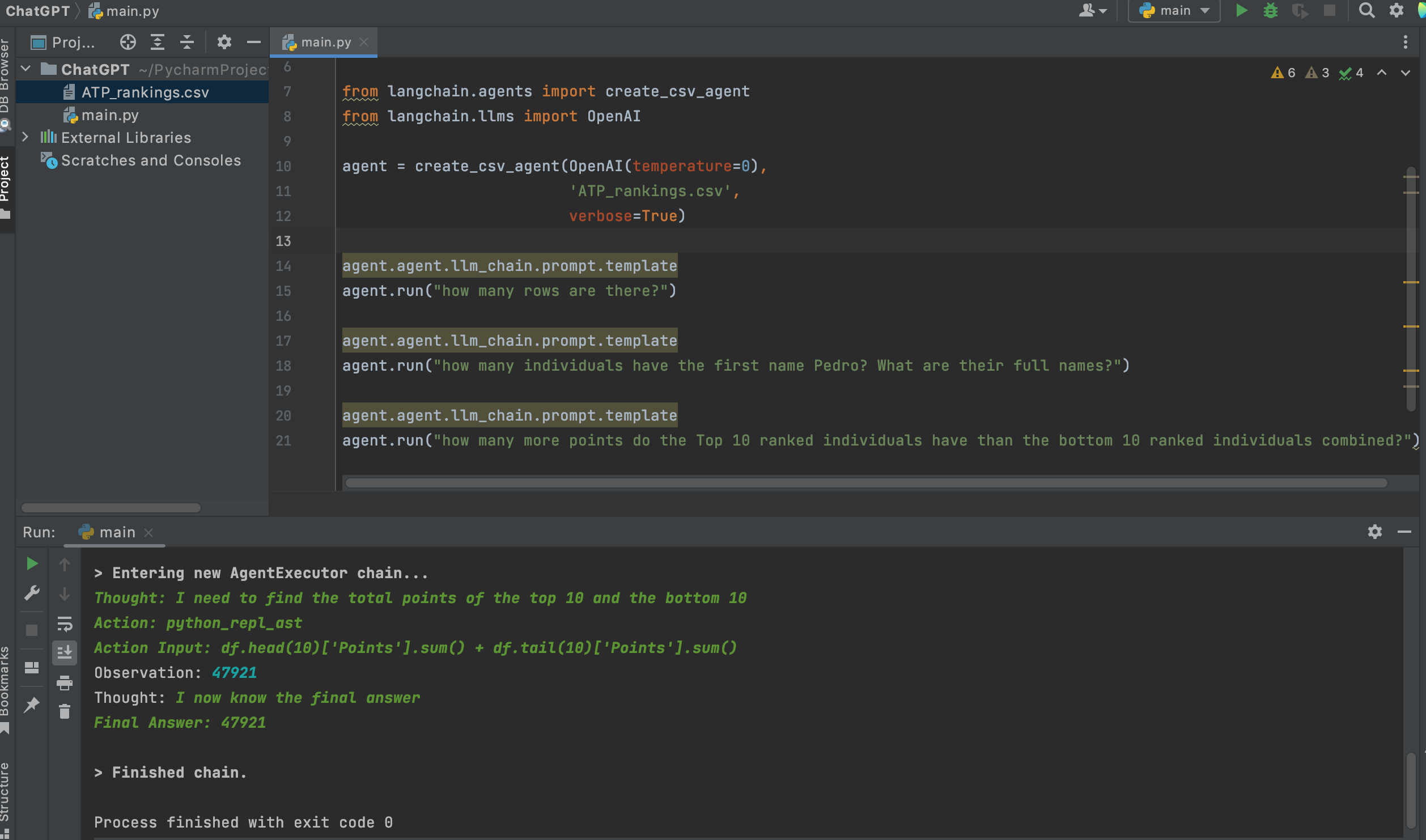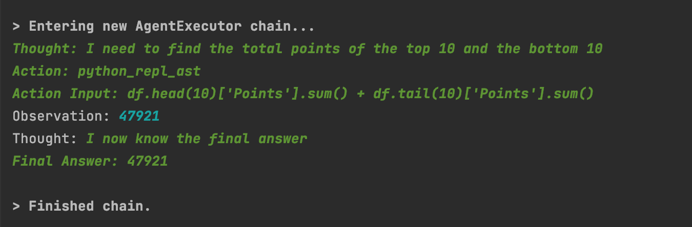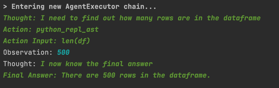 When we run our command, it translates our question into a thought. It will then take that thought and create an action, almost as if you ask an analyst how would you answer it in code. It then computes that action and gives us an observation. Of course it is no surprise our Top 500 ranking of mens tennis has 500 records in.