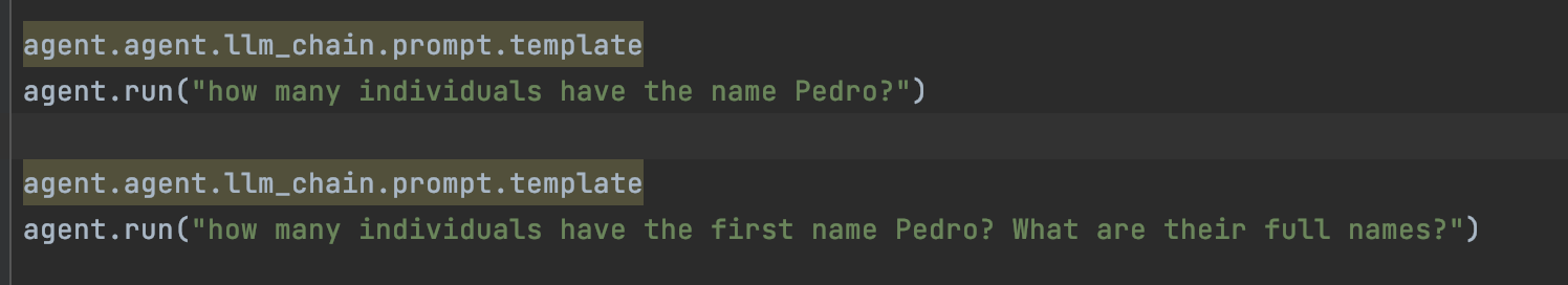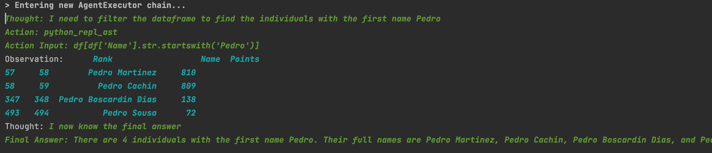 Now if I was to ask the agent, how many people in the dataset are called Pedro it will give us zero.