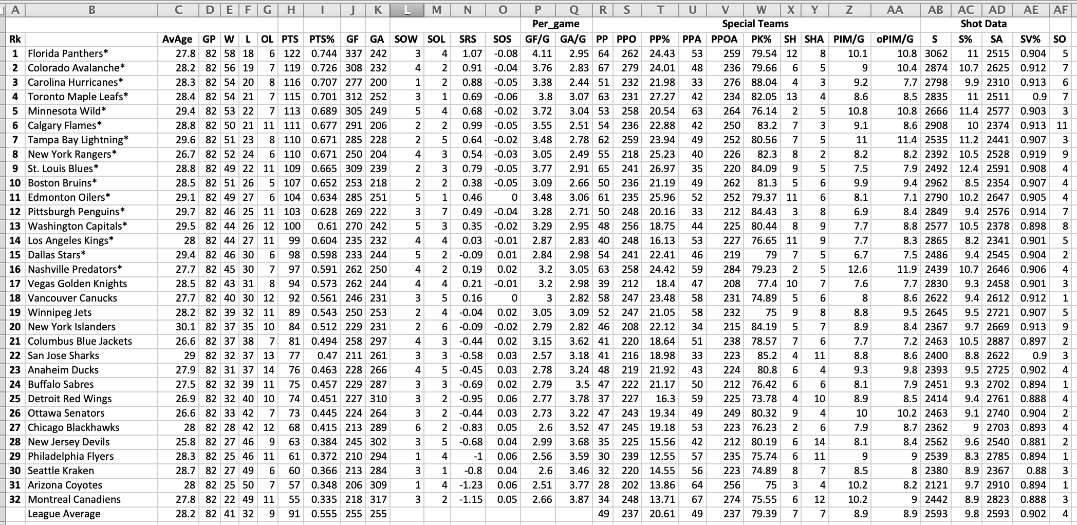 The original data is found from hockey-reference, below is an example of one of the data tables required.