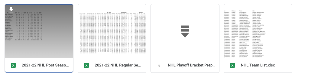 Jared: The desired output is supposed to fit into the curvy tournament bracket, so I had to ensure the end result was something that would plug into that workbook easily. Luckily, the data sets already had the team ranking embedded in them so I didn’t have to worry about calculating the rank and various tie breakers. The biggest thing to work out was the original match ups. In the NHL, 3 playoff spots are guaranteed for each Division. There are 2 Divisions in each of the 2 Conferences for a total of 4 Divisions. There are then 2 Wild Card spots for each Conference. The Wild Cards have to face the first place team from each division so that was the piece I had to really pay attention to for the rest of the bracket to line up correctly.