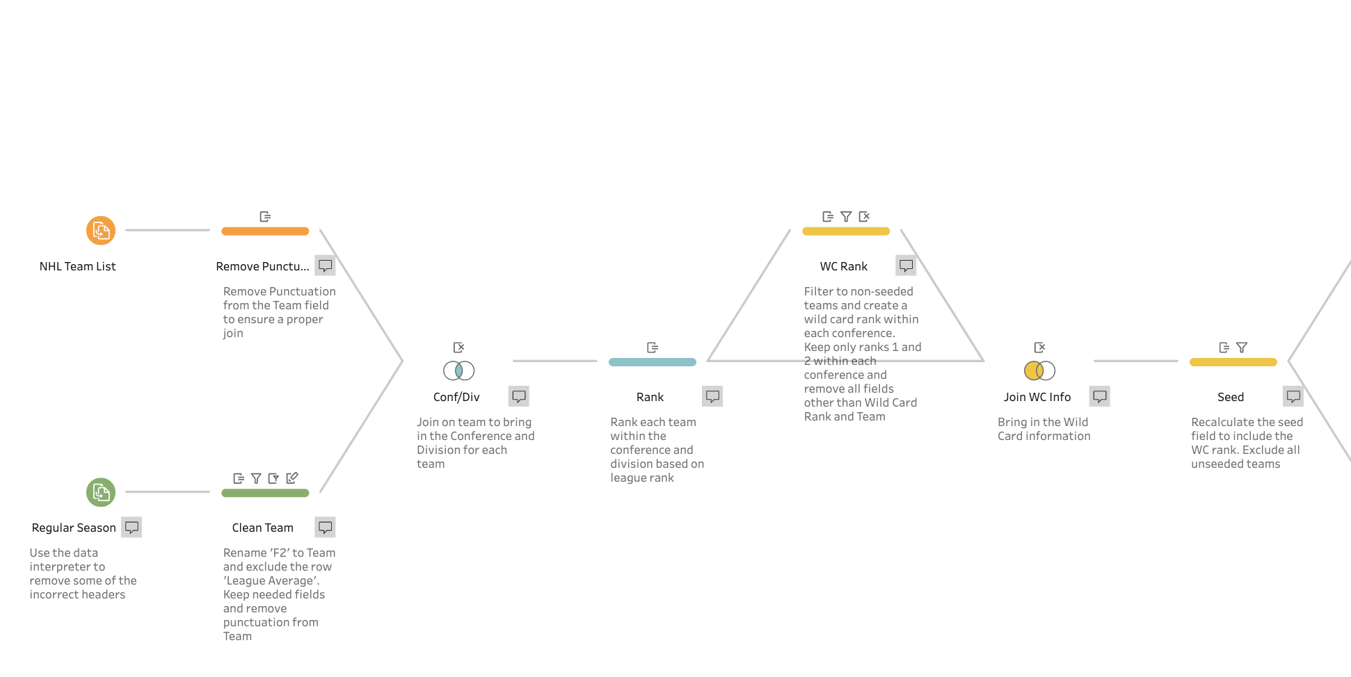 CJ: I would highly recommend downloading the workflow and giving it a go yourself to build an NHL bracket. Jared has very kindly commented the workflow throughout. Notice some of the early steps are looking to clean up some of the different field names and then assign them a ranking.