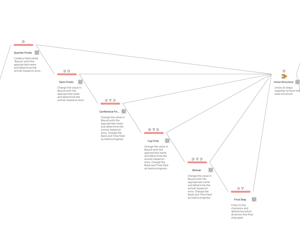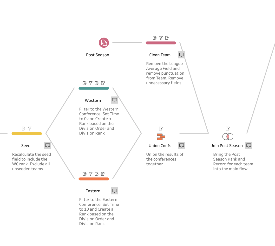 After determining the correct match ups, it was a matter of re-ranking the teams in order to get the points in Tableau to line up correctly. It took a few tries but ultimately came together really nicely. The only problem with the flow is that it only fits one very specific use case and you’d have to do a bit of work to mold it for a different sport. Perhaps later I’ll try parameterizing it to work for different sports but for now I’m happy with the result.