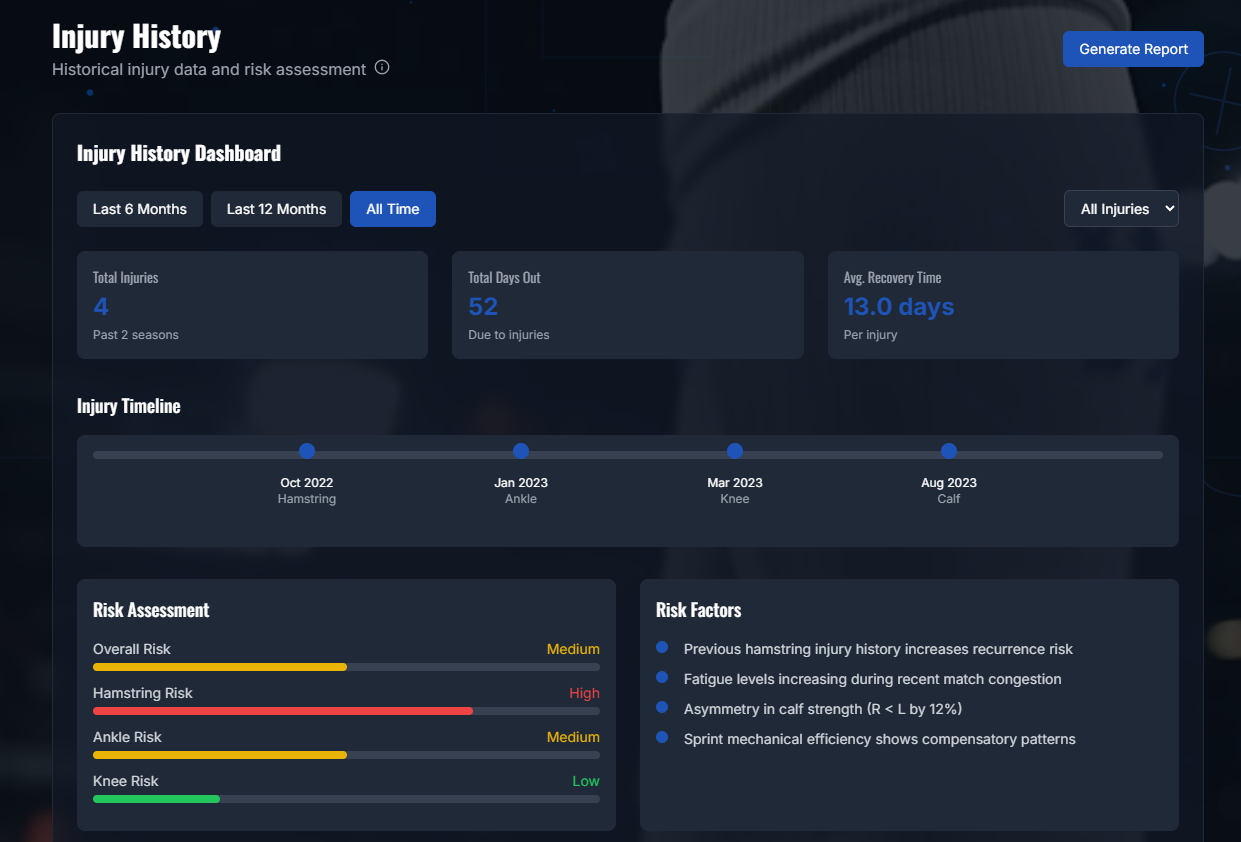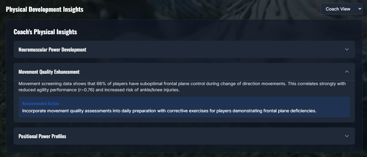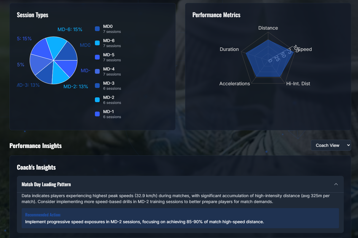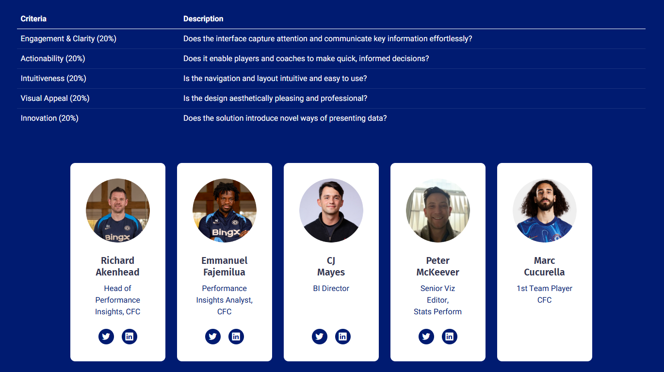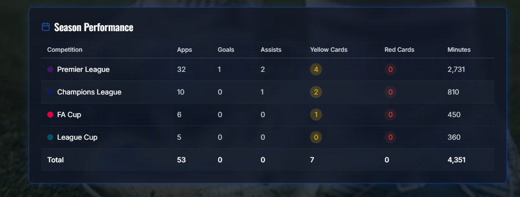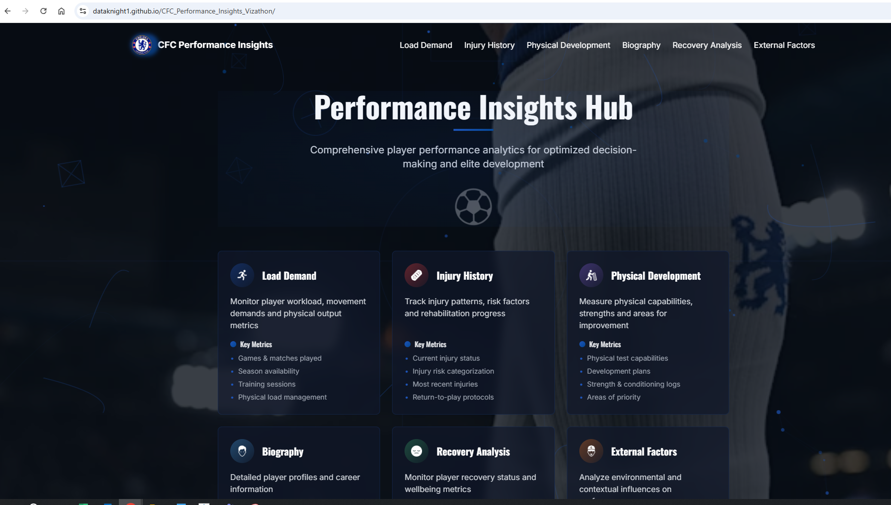 CJ: Tiagos entry can be found here.CJ: What is it about football analytics you find fascinating? Of the 6 different modules in the competition, what stood out to you when you started creating your charts?T: What captivates me most about football analytics is the relentless quest to master the sport’s inherent unpredictability. Every week, we dedicate countless hours to developing data-driven models, whether grounded in expected-goals, passing networks or sequence analysis, so that by match day we can tip the scales, however slightly, in our favor. That moment when theory materializes into actionable insight on the pitch is, to me, the very essence of its magic.When I turned to the Load Demand module for the Vizathon, I found it especially compelling because it anchors every analytic perspective in real-world context. In modern football, fixture congestion and training availability are arguably the single most critical factors affecting performance. Consequently, I focused on crafting visualizations that not only convey workload metrics but also remain instantly intelligible, allowing coaches and analysts of any background to grasp the core message at a glance.CJ: Of the 6 modules, which do you think are the easiest, or hardest metrics to obtain. How does bringing all these metrics together help go from insight to action?T: Of the six modules, training-intensity metrics are by far the easiest to obtain, thanks to the proliferation of IoT devices, GPS trackers, accelerometers and heart‐rate monitors, that stream load data in real time. Modern sensor networks can capture every sprint, tackle and rest interval, enabling immediate analysis of workload without manual intervention. Conversely, recovery metrics present the greatest challenge, owing to the vast genetic and physiological variability among players. With roughly 30 trillion cells per individual and twenty-plus athletes per squad, each body responds uniquely to stress and treatment, as a result, pinning down precise recovery timelines or injury‐risk thresholds remains more art than science.Bringing all six modules together transforms isolated observations into a coherent decision-support system. By first defining clear, outcome-driven questions, each visualization is crafted to answer a specific operational need, be it optimizing rotation schedules or identifying fatigue‐induced performance dips.CJ: One thing that particularly shone through was how cohesive the site felt. Could you walk us through the tech stack you use to build the site?T: The technical decisions behind my Chelsea FC Performance Insights platform weren't made in isolation, they emerged from the specific challenges I faced trying to build something genuinely useful for football analytics while working within realistic constraints.I chose GitHub for hosting because I needed something that would just work without becoming a project in itself. When you're building a data-heavy application like this, deployment complexity can easily consume more time than the actual development. GitHub Pages solved this easily, push to main, and the site updates automatically. More importantly, GitHub's integration with the development workflow meant I could iterate rapidly without context-switching between different tools. The version control aspect became crucial when working with Claude Code, since I needed a reliable way to track what changes were being made and why. Having everything in one ecosystem such as code, issues, deployment, documentation, eliminated the friction that usually kills side projects.Using Claude Code as my frontend engineering partner was perhaps the most transformative decision. I didn't approach this as "AI helping with coding" but rather as "AI as a specialized team member." Claude Code could maintain context across the entire codebase, understand the design system I was building, and implement complex features while staying consistent with established patterns. When I needed the animated football pitch background, I could describe the visual effect I wanted and Claude Code would not only implement it but integrate it properly with the existing CSS architecture. This wasn't just about speed, it was about having a partner that could handle the tedious parts of maintaining consistency across dozens of components while I focused on the bigger architectural decisions.React became the obvious choice once I understood what I was really building. This isn't just a website displaying football data, it's an interactive analytics platform where everything needs to respond to user input. Players click between different time periods, filter data by various criteria, export reports, and drill down into detailed views. React's component model maps perfectly to how football analytics actually work: you have players, you have metrics, you have time periods, and you need all these elements to interact seamlessly. The virtual DOM ensures smooth performance even when updating complex charts and tables, which matters when you're dealing with real-time data exploration.The Next.js decision came from understanding my deployment requirements and performance goals. I needed static site generation because this would eventually be hosted on GitHub Pages, but I also wanted the developer experience of a modern React framework. Next.js gave me both, I could build with modern tooling and deploy as static files. The framework's API routes let me prototype with mock data during development while keeping the door open for real data integration later. This architectural flexibility proved essential as the project evolved.TypeScript integration happened because I learned from previous projects where small data handling errors cascaded into major debugging sessions. When you're transforming player performance data through multiple calculation layers before rendering it in charts. TypeScript caught countless issues where data structure assumptions didn't match reality, particularly when