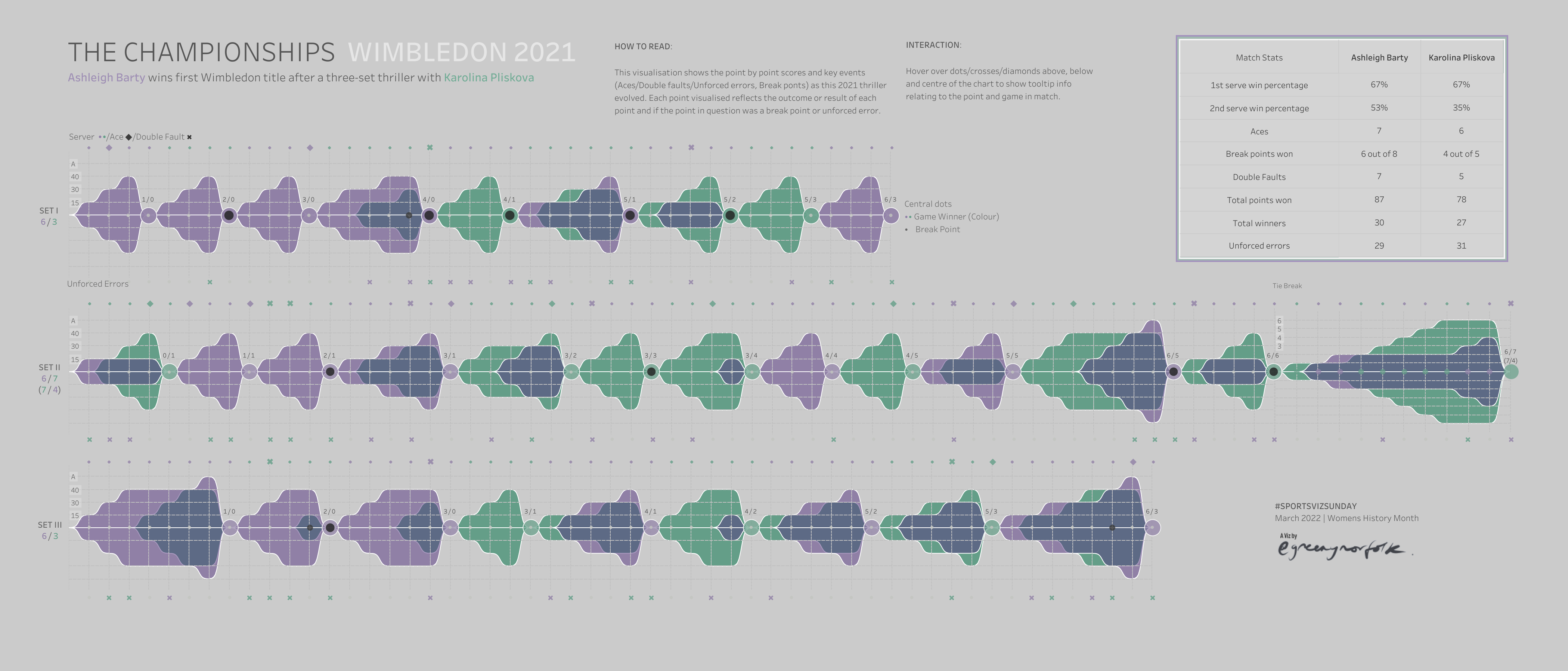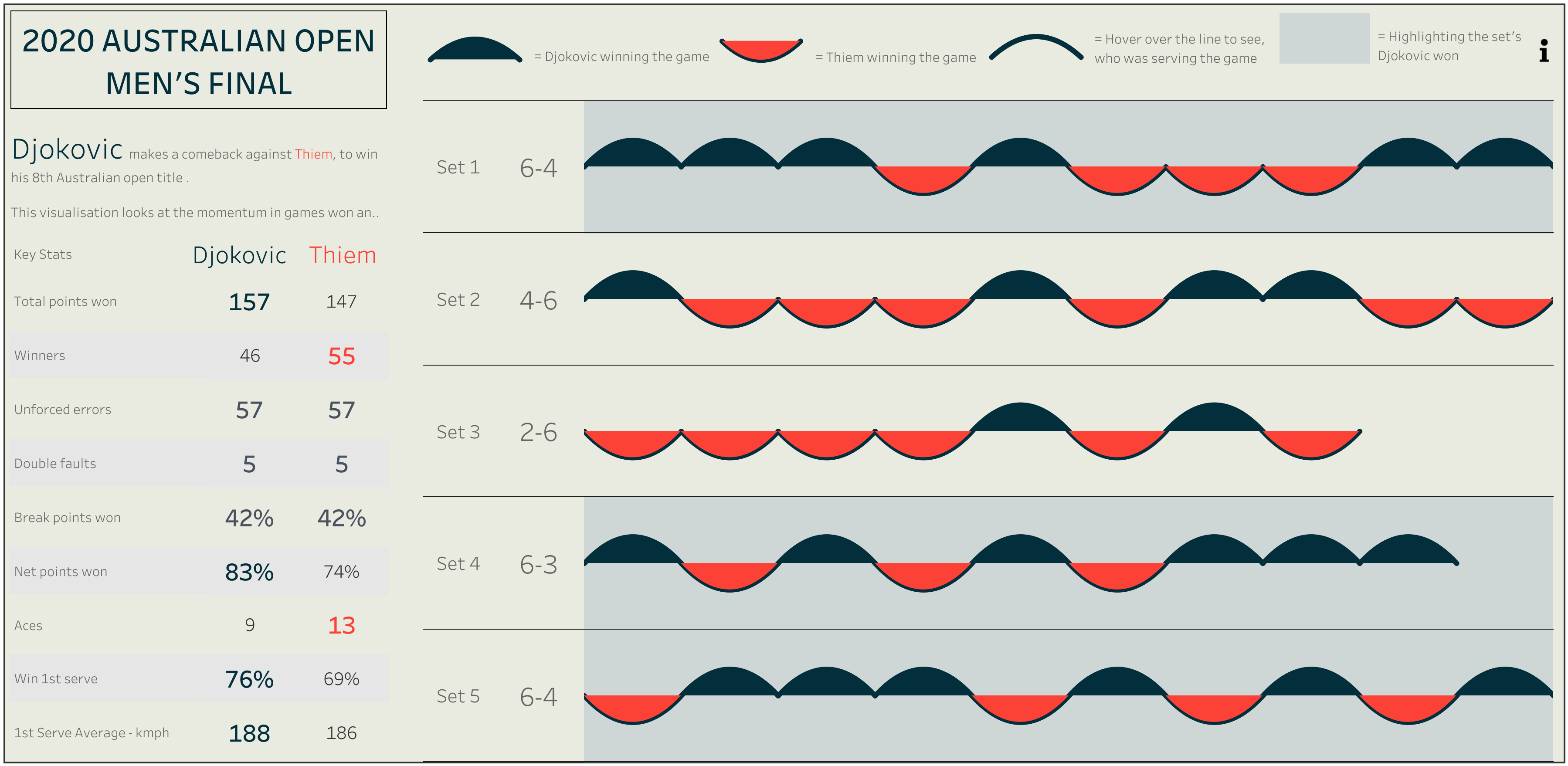 This visualisation from Varun Varma is a creative way of showcasing each game through a smooth curve. I think this method is a really nice way of showing dominance during a set, the breaks of serve and overall length of the set comparing them game for game.