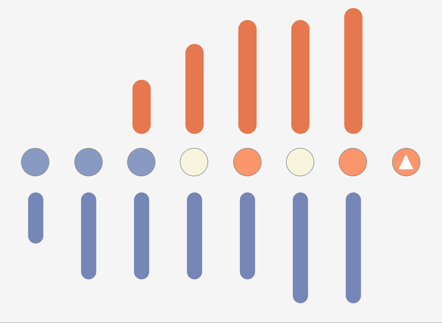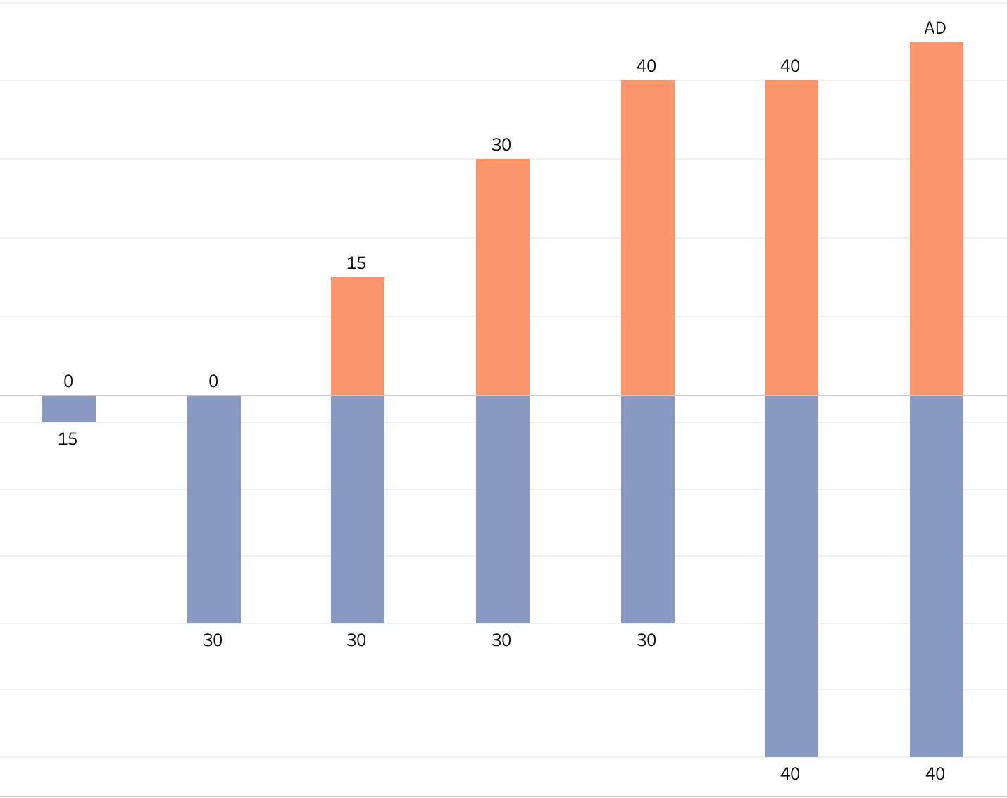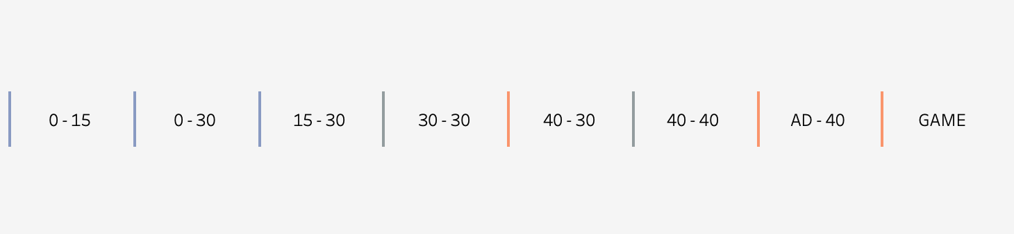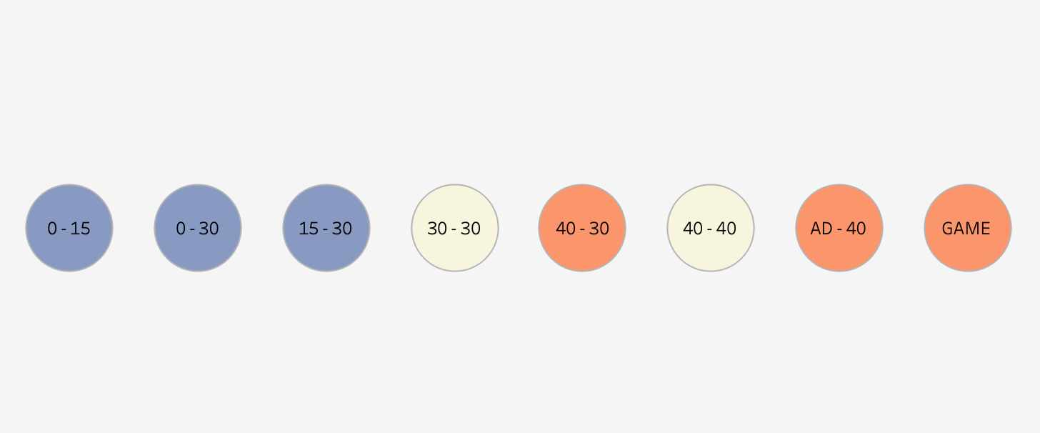 The second thing I love within this visualisation is the slanted lines. So without a union in the dataset we probably can't create this effect but we could replicate it as bars. A couple things to note with this is, how much is 'advantage point' worth as a bar length. I do however think this method shows the build up to a winning game quite nicely. Some more considerations are deciding whether each point should be worth an equal distance. For example 15,30 and 40 are not equal in range... but theoretically a point is equal in value.