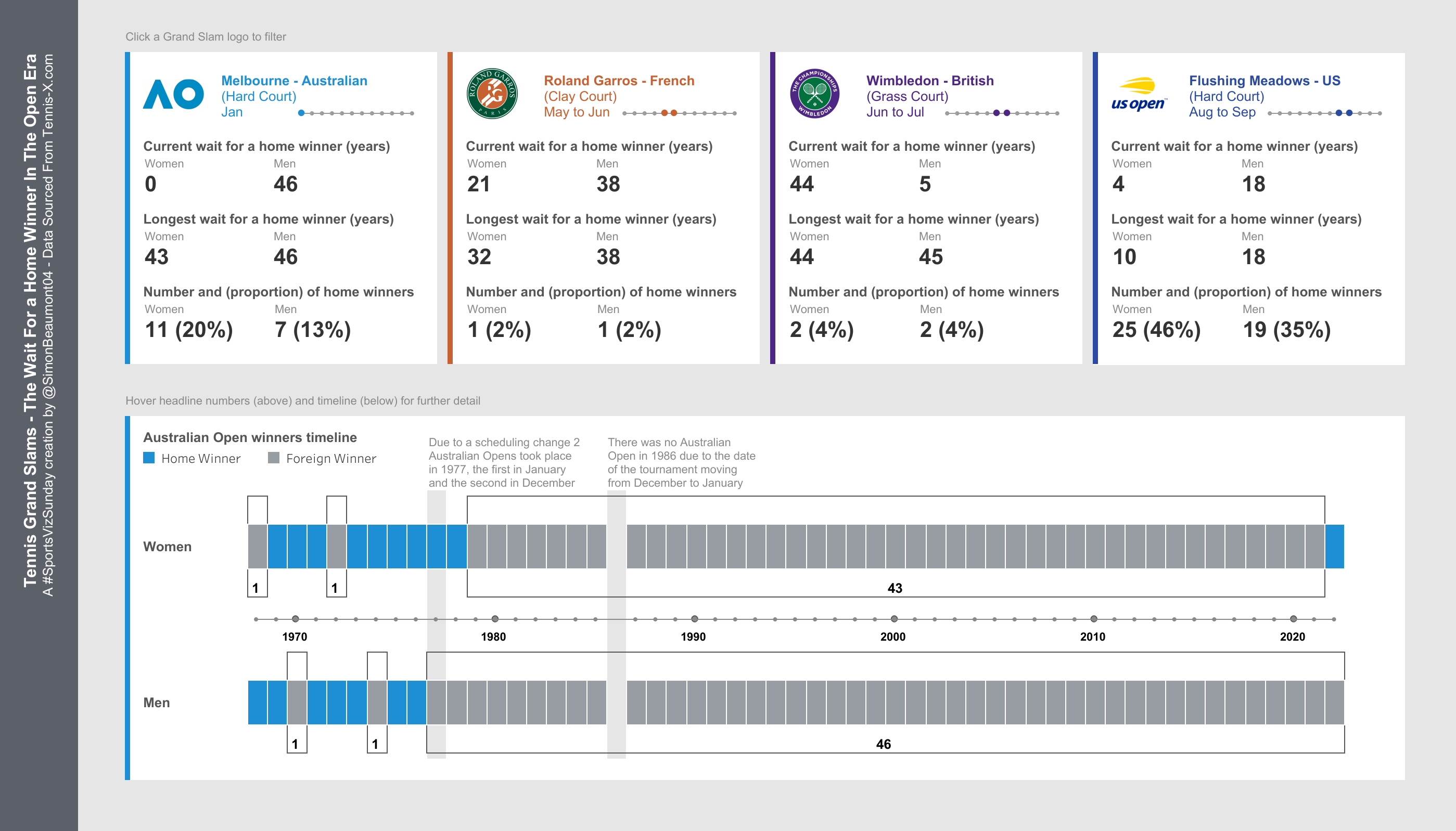 So I LOVE visualising tennis data, and fortunately have had the time to make about 13 tennis visualisations showcased on Tableau public, some regrettably a little earlier on in my career. But one thing that has stood out to me is the different levels of data you can chart, be it grand slam winners, all matches, point data, shot data, match summaries or even tournament brackets.