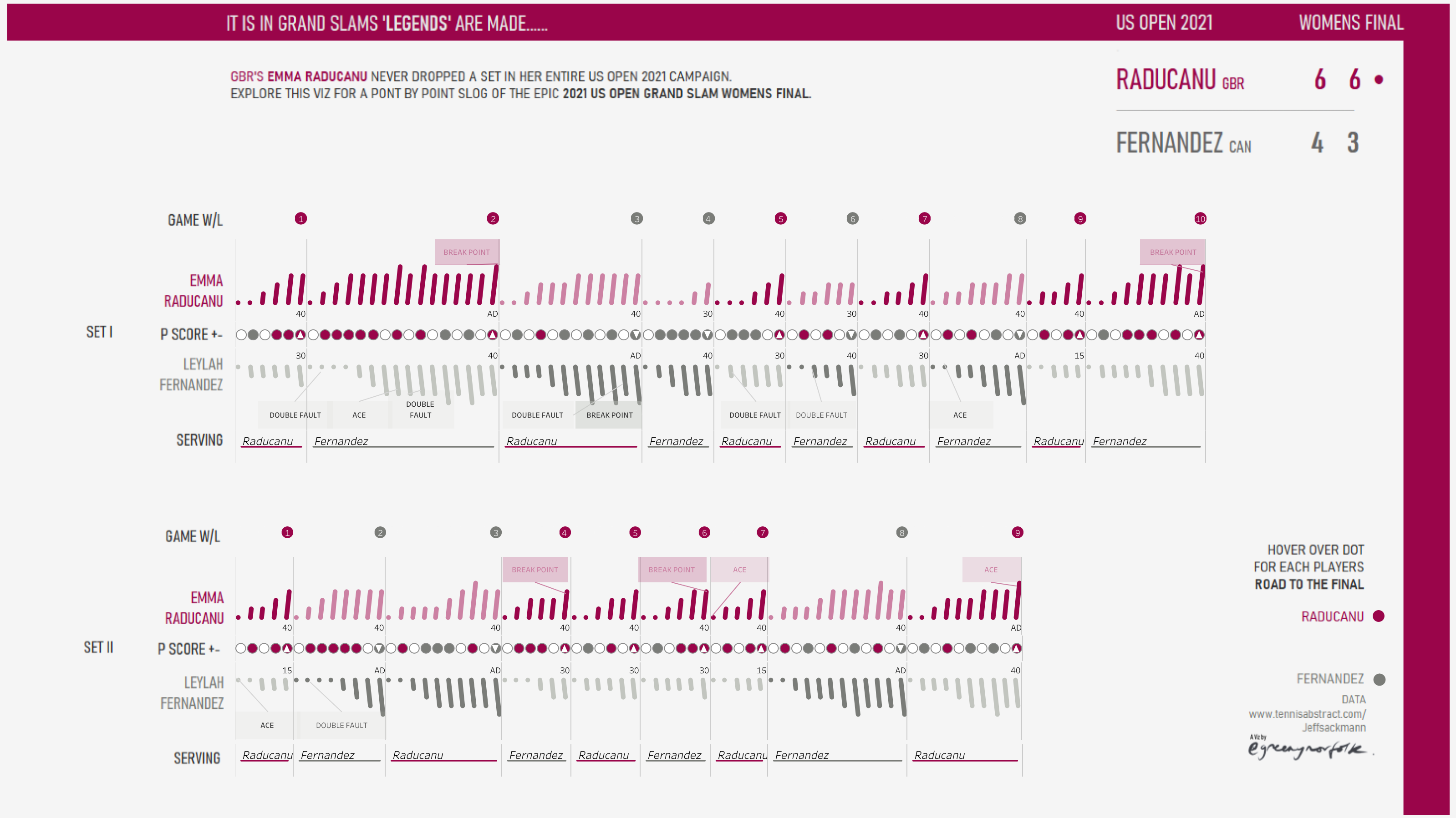 Let's start with the Radacanu viz. I love the Points Score. To showcase each mini recreation I will be using the Naomi Osaka - Serena Williams data found here. The workbook to follow along can be found here.