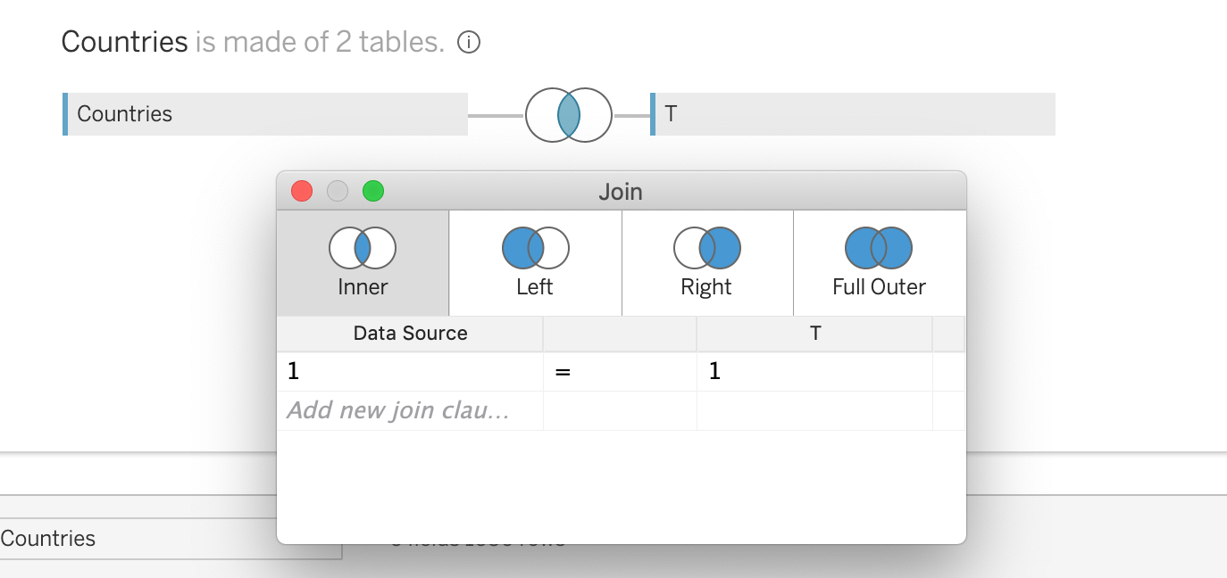 We will want to join the sheets with a custom calculation of 1 = 1. This duplicates our dataset with 100 rows for each country as we will use these points to create circles.
