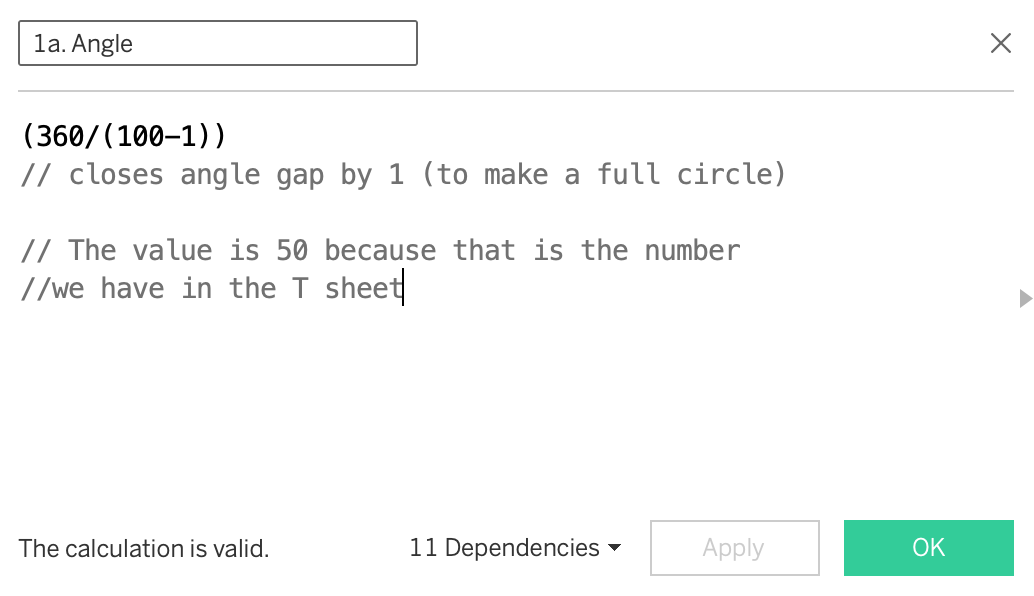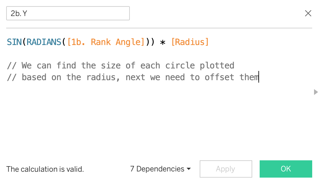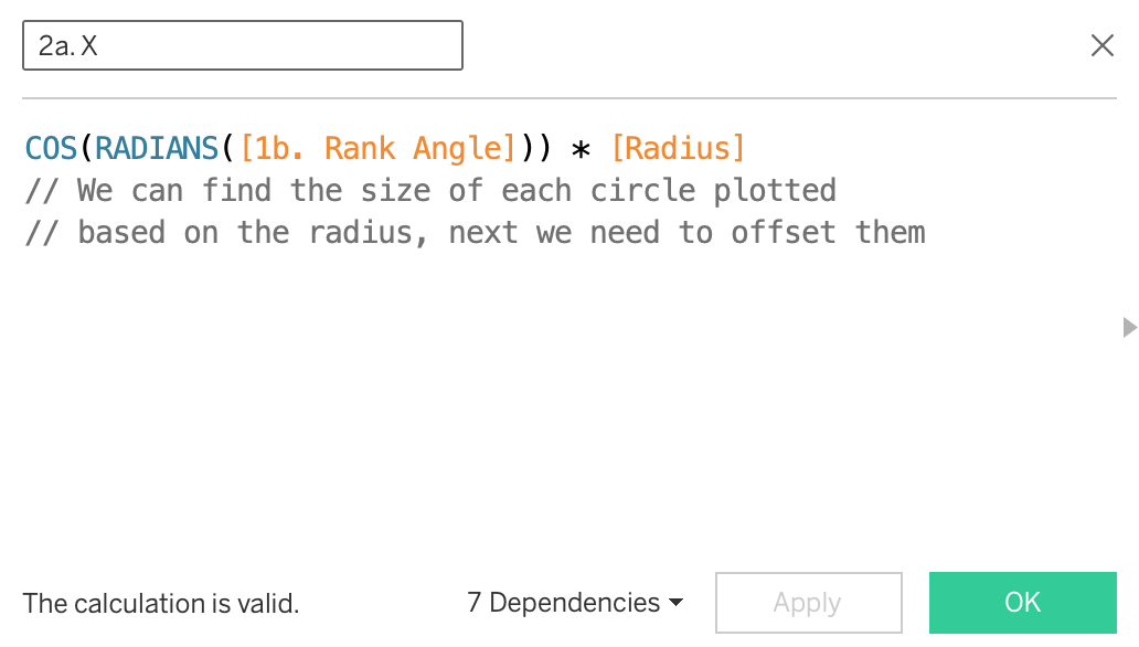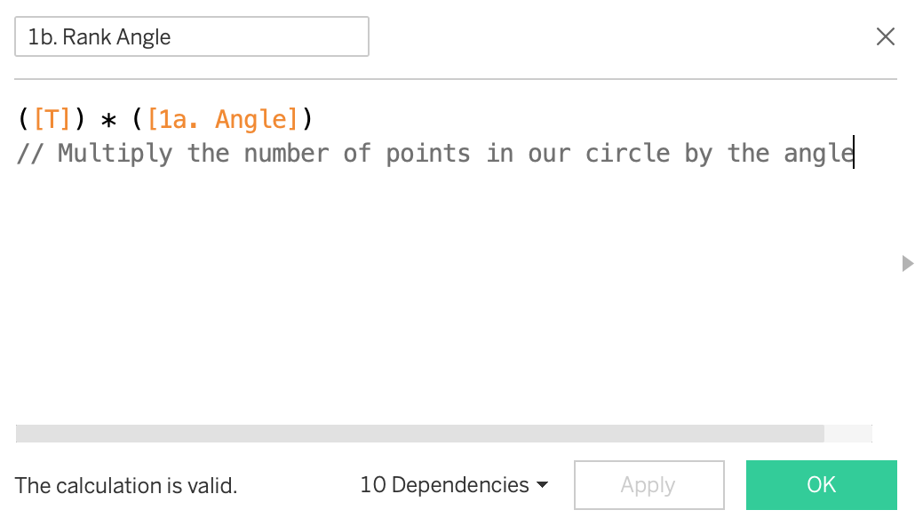 Rank Angle - Find the angle for each point. If you've followed my blogs you will see I tend to build most my radial vizzes using the same logic.