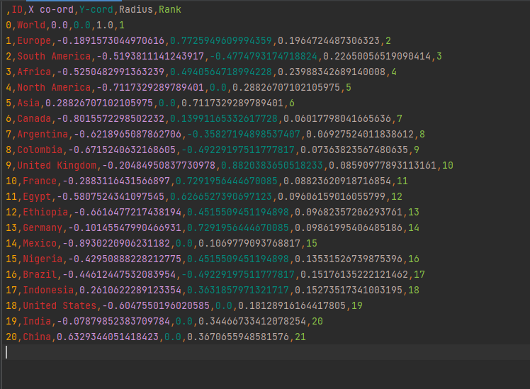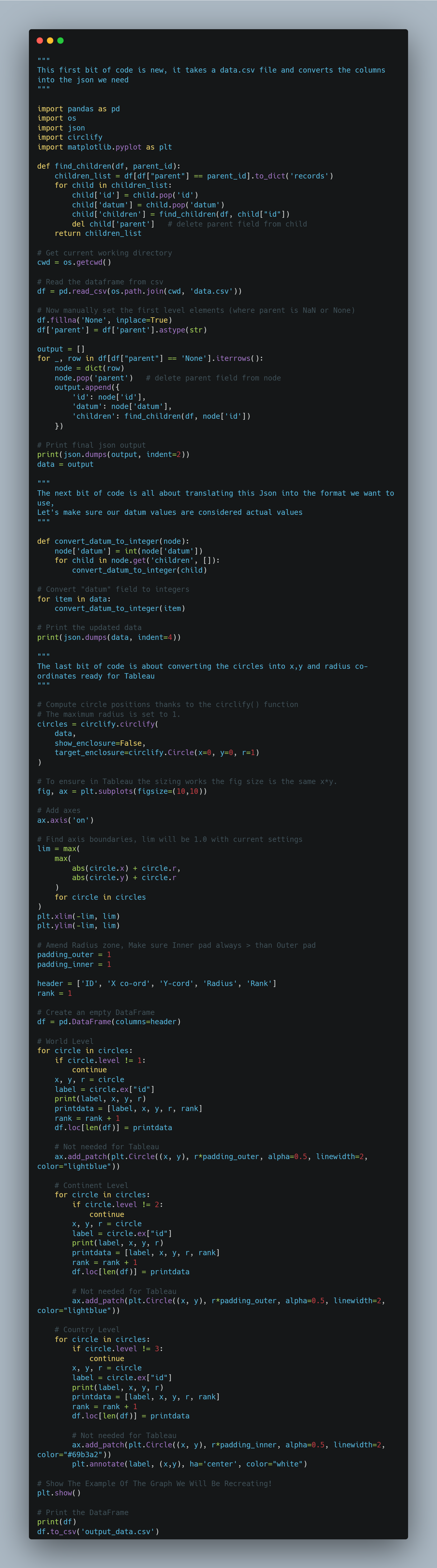 Overall, this code takes data from a CSV file, converts it into a nested JSON structure, calculates circle positions, and visualizes the circles using matplotlib. It also saves the processed data to a CSV file for further analysis in Tableau.