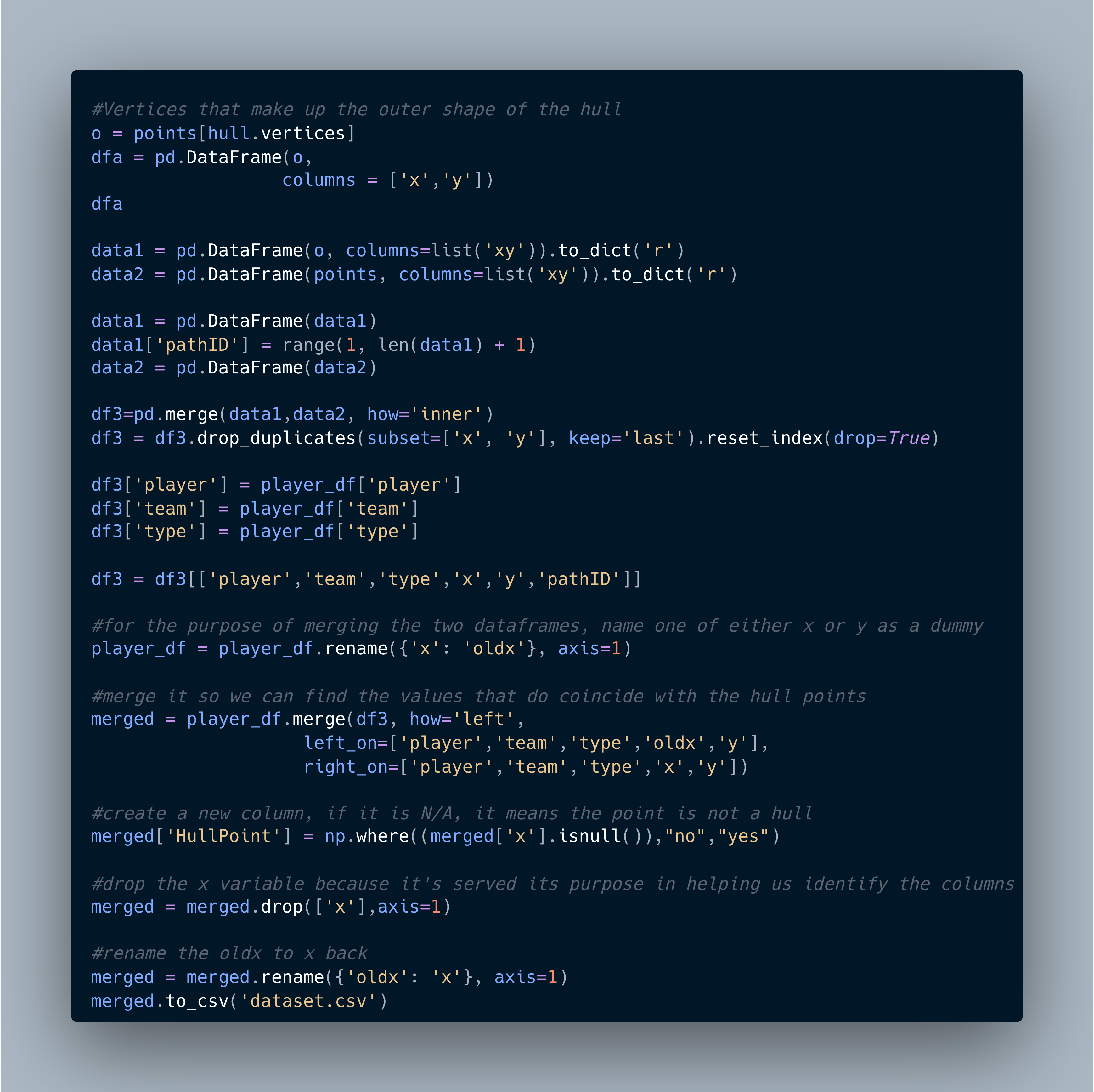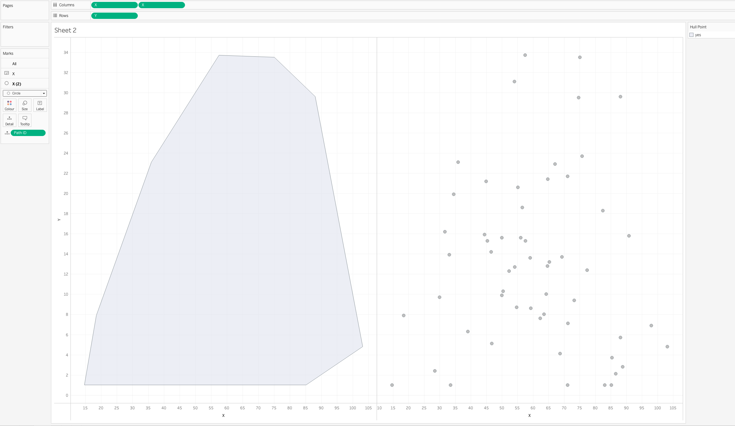 We take the hull points and anticlockwise add into the dataframe a pathID. This is really important as it will be what we utilise on our path in Tableau, without it, we do not know what order to join the points. Fortunately, the package orders the points in anticlockwise order.