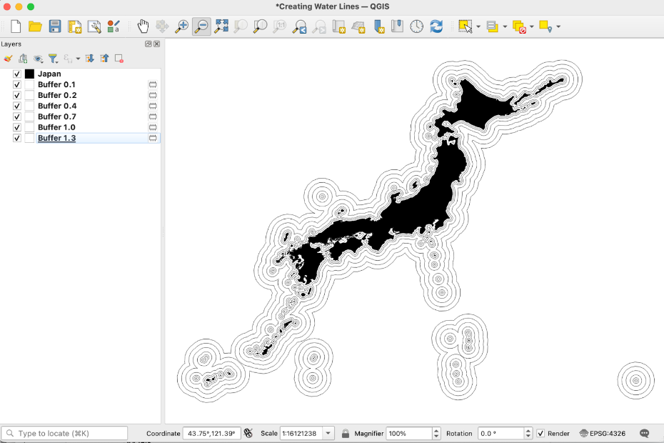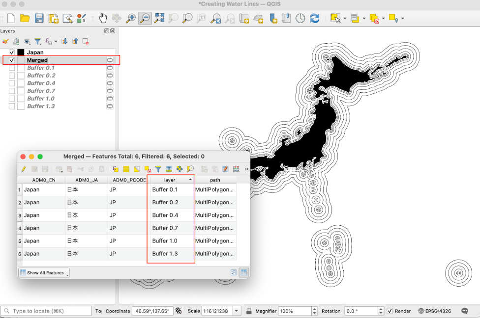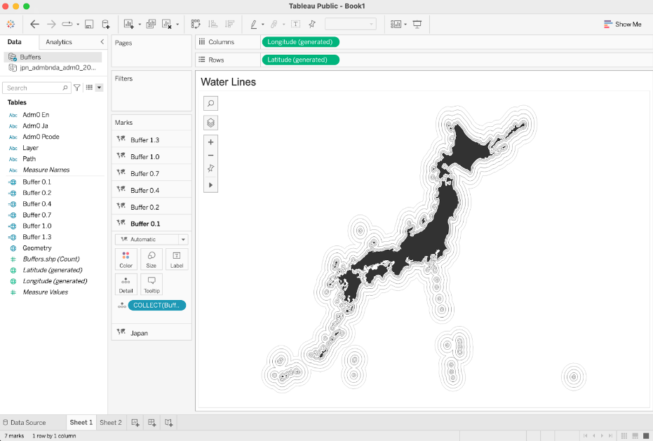 D: Back in January of this year, I started a series called #RandomQGIStoTableau, which I describe - over a thread of 4-5 short tweets - how to create spatial features in QGIS that can be used to enhance your maps in Tableau Public. One of my earliest posts focused on creating “water lines”, And thanks to CJ, I have more space in which I can actually write complete sentences, so I’m going to describe the process in a bit more detail. Have I mentioned that I love maps? The inspiration for this came from looking at old maps, such as this one. I later came across Olivia Vane’s writings on water lines.So, the general approach is use QGIS to create a shapefile that has the desired geographic feature. Then we simply have to bring in and add it as a map layer in Tableau. In the case of water lines, we can use the BUFFER tool to create a series of polygons that surround the target geography at different distances. Tableau also has a buffer function, BUFFER(), but as far as I know, you can only create buffers around points right now (hint, hint…). The first step is to add your target geography. For this example, I will be starting with a shapefile of Japan (Source: Humanitarian Data Exchange). To create our first buffer, select the BUFFER tool either through the menus (Vector → Geoprocessing Tools) or the Processing Toolbox (under Vector Geometry).In the Buffer dialog window, select your target geography in the “Input Layer” field and input your desired distance in the “Distance” field. You may need to play around with the values. In this case, I wanted to mimic the ripple effect, so I increased the distance slightly with each buffer. Repeat this step until you get the desired number of buffers. For example, I decided to go with six buffers at the following distances: 0.1, 0.2, 0.4, 0.7, 1.0, and 1.3 degrees. The result is 6 polygon feature layers that surround the geography of Japan at varying distances. A few important things to note here. First, buffers are essentially polygons so you can play with the fill and line (border) colors to get the desired effect. Second, if you have a water body as your starting geography, you will want to use negative values for your distances to obtain internal buffers. For example, in my earlier post, I started with the Great Lakes. At this point, you have two options. On one hand, you can save each of these layers as a shapefile to be used in Tableau by right-clicking on each layer and selecting “Make Permanent”. While it’s a bit more trouble to bring in the various files into Tableau, keeping them as separate files will allow you to manipulate each buffer (formatting, color, opacity, etc.) as separate map layers.On the other hand, you may want to first use the Merge Vector Layers tool to merge the layers into a single layer that you can then save to be used in Tableau. And if we look at the attribute table, you will notice a “Layer” field that has the name of each layer. This will streamline the process of bringing in the data, but you may still want to separate each buffer as separate map layers for formatting purposes. You would then have to create a series of calculations, such as the following: IF [Layer] = "Buffer 0.1" THEN [Geometry] ENDNow you’re ready to bring-in the data and visualize the water lines in Tableau Public. If you need more information about working with map layers, Marc Reid has a great article here