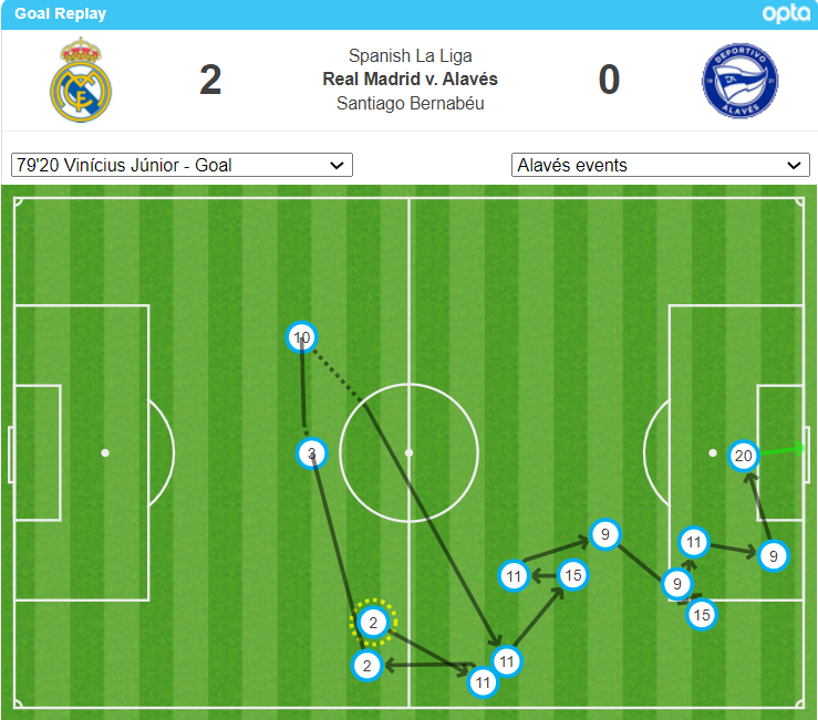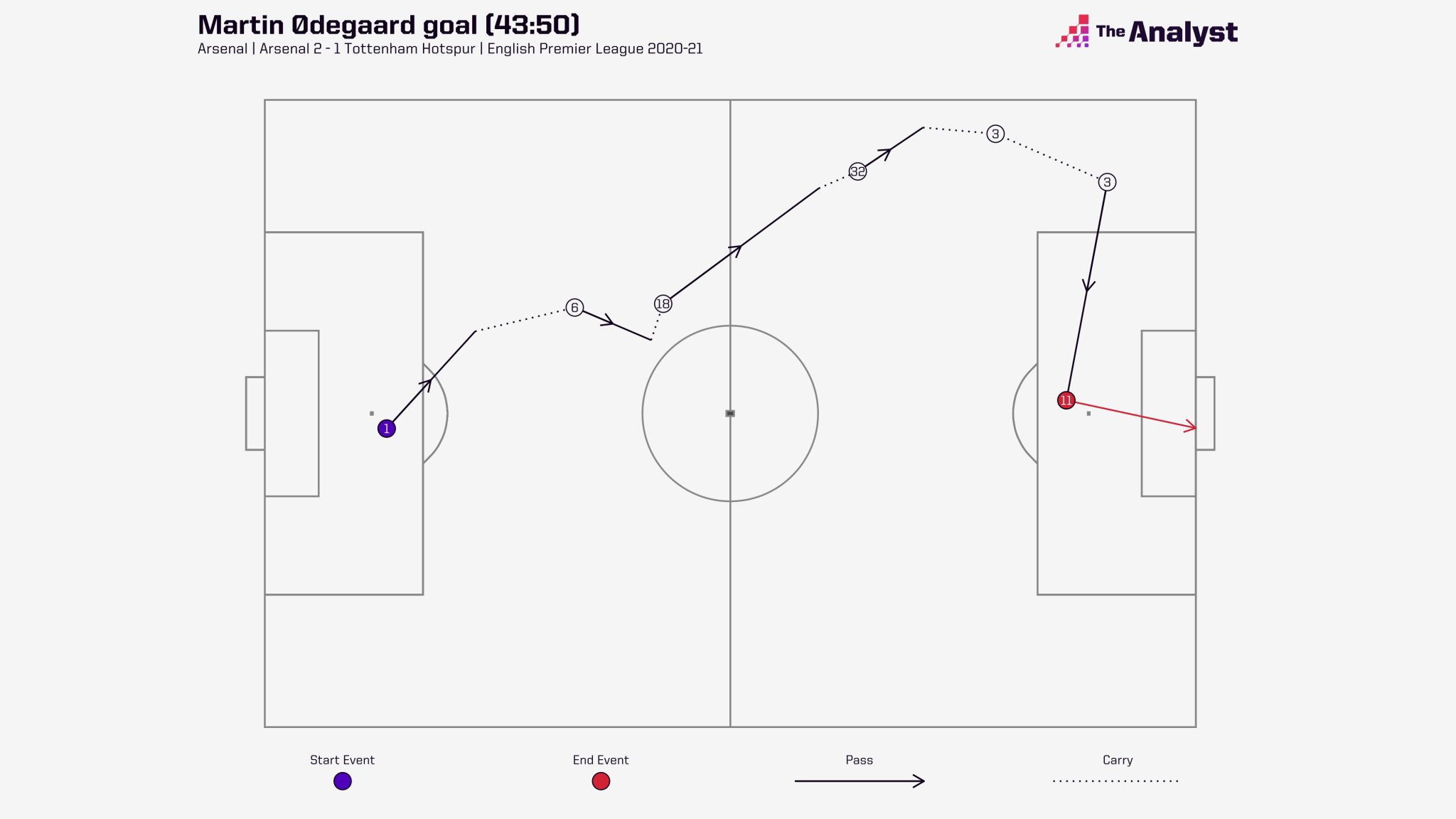 Simple in design, beautifully presented and is able to provide context to the different carries, passes and part of the pitch used in building up to the goal.
