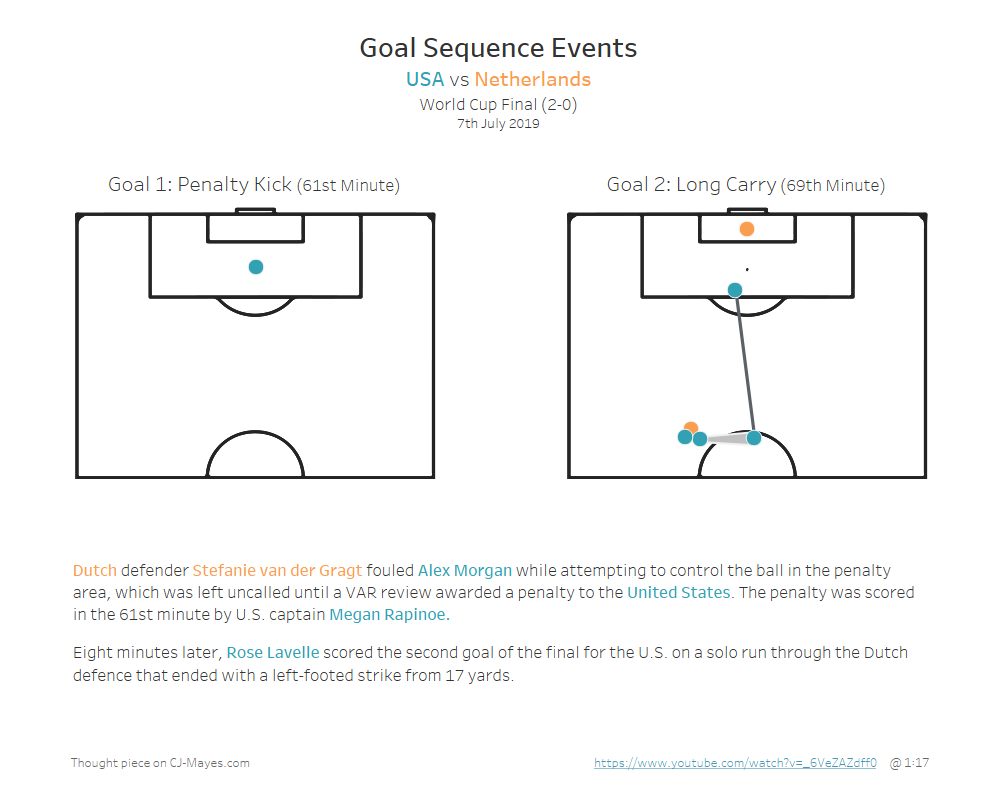 Football can be a scrappy game. Unless you have proper context behind the sequence of events, it's actually quite hard to understand sometimes from data on it's own. In my example below you can see how Rose Lavelle scored the second goal of the final for the U.S. on a solo run through the Dutch defence that ended with a left-footed strike from 17 yards.