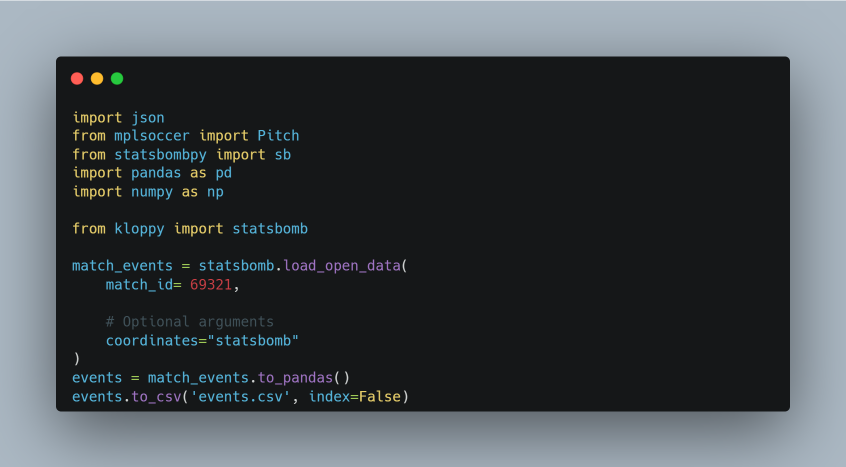 Above is a code snippet I used to access some simplified StatsBomb data, using the Womens 2019 World Cup Final as the example.