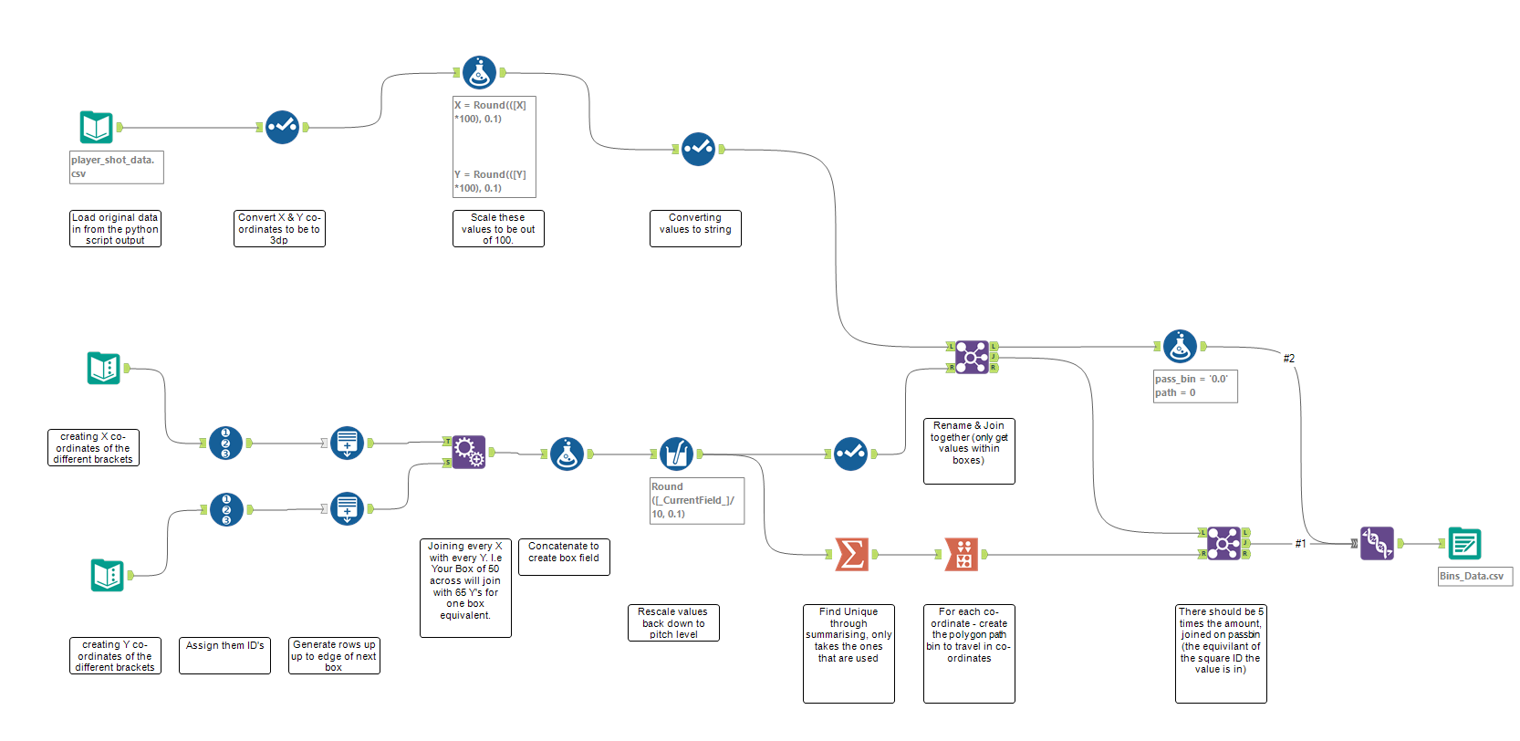 The top half of the flow takes the original data from the python script output from a blog post you've previously written, actually. I then convert all the values to be eventually 1 decimal place. We have to remember that these X and Y coordinates are important when building the background football pitch.