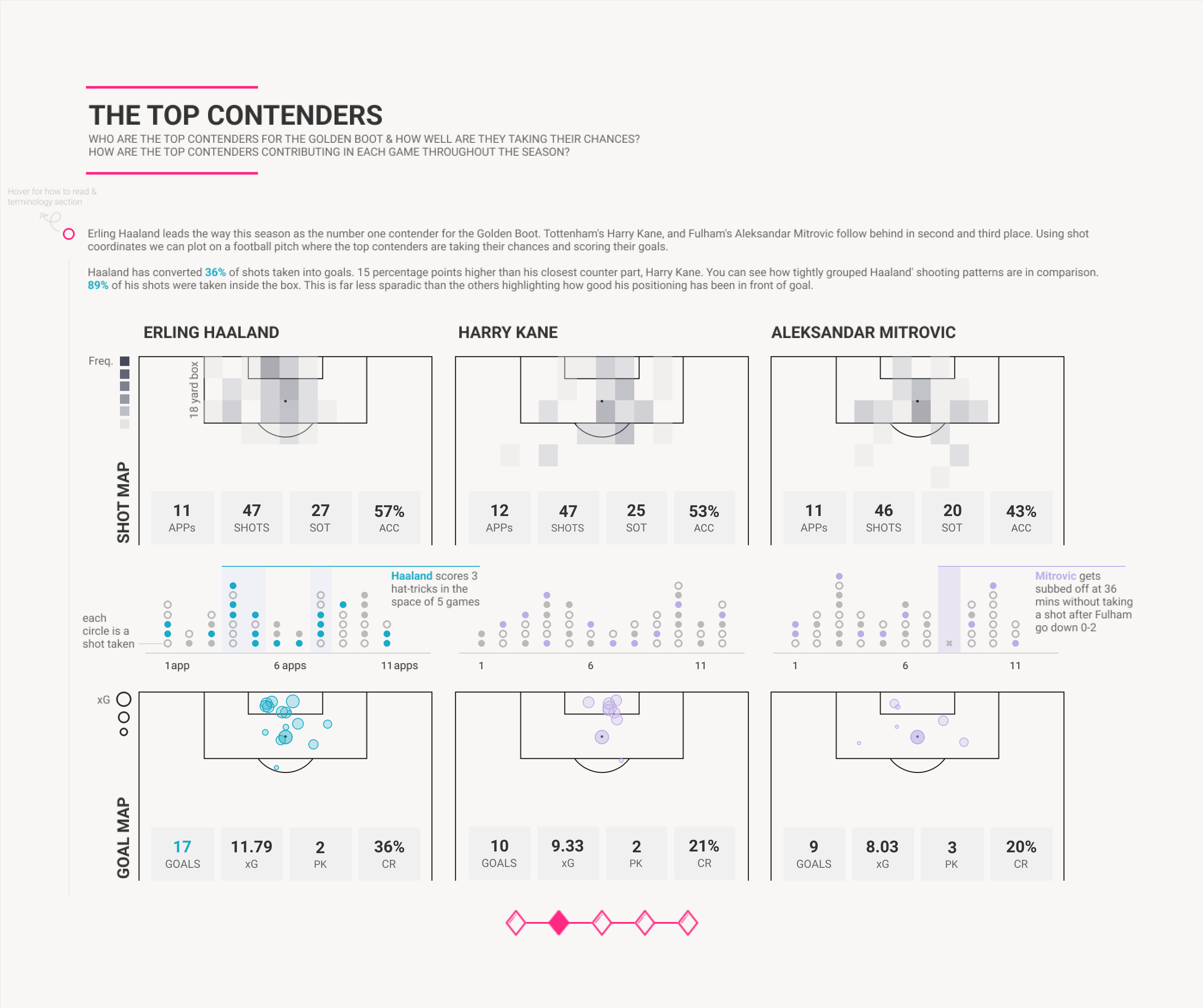 Finally, I added the count of ID to colourwhich is equivalent to a shot taken in my data. This will give you the heatmap-style look.CJ: Besides the technical expertise and the beauty in creating such a delicate shot map, what did you want people to take away from reading these types of charts when looking at Kane, Haaland and Mitrovic?I wanted to show where exactly each striker was taking their chances from in front of the goal. Did they favour a certain area or what percentage of their chances were taken inside the box? We know that if you're taking chances in front of the goal in key areas there's a much higher likelihood you will score than if you're taking chances outside the box for example.I think the shot map shows this clearly and the key takeaway for me is that Haaland’s spread of chances was tight and right in front of the goal as opposed to the others who were far more sporadic and took more chances outside the box. Haaland’s positioning in front of the goal this season has been incredible and in my opinion a big reason for his success so far.CJ: You mentioned your work was inspired by a few other pieces/people in the community. Are there any specifics you’d like to call out, especially from a design perspective?Yes, definitely I'm always on the lookout for inspiration. First and foremost, I like to look outside the data viz bubble for design inspiration. I have a particular interest in cinematography and web/app design and I think there are a lot of lessons that can be learned from these industries when it comes to good storytelling and design principles.For this particular project, I did spend a lot of time on Twitter, specifically the accounts @jonollington @sonofacorner @petermckeever. They all have great content so if you're interested in football they are a must-follow. @sonofacornerfor me especially stood out. I love the aesthetic look of his work. The minimalist style of his designs and the way he is able to convey his analysis directly and clearly is something I tried to incorporate in my IronViz.CJ Round-Up: