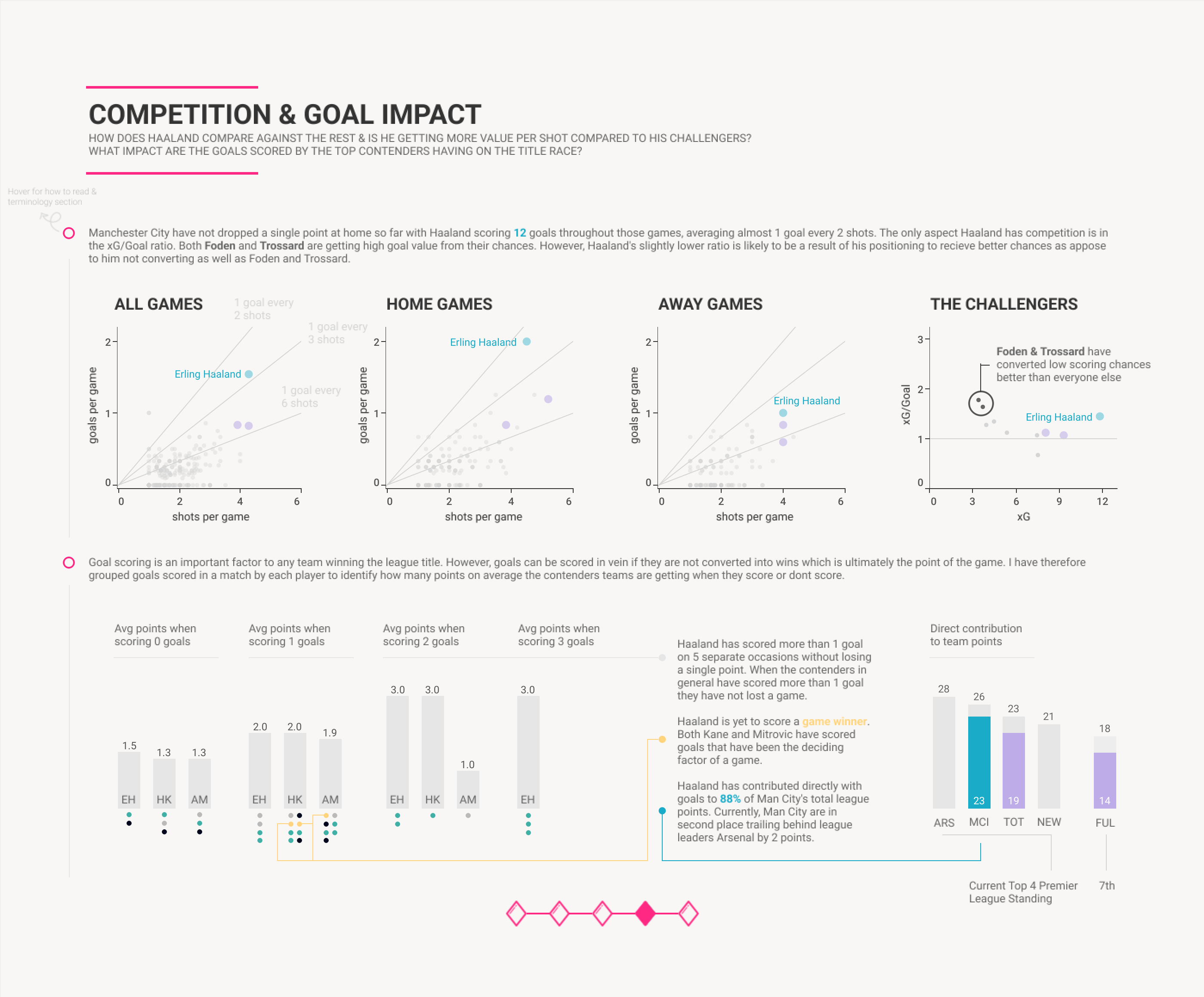 I am so excited today to have Fuad join the site today to showcase an alternative method of creating heatmaps, this time using Alteryx and Tableau. Fuad can be found on twitter, here.Many of us by now have the logic to create them probably using either python or r, and whilst that may do the job justice, I am a huge fan of being able to emulate similar outputs in other software.I think with different software come different methodologies (whilst perhaps a similar approach), but also allow flexibility in output and certainly have allowed Fuad to flex his design skills.Speaking of output, for me, Fuad Ahmed created one of the most beautiful soccer vizzes I have seen all year. I would urge you to check out his full visualisation.CJ: Fuad, great to have you join. Can you tell us a little more about your passion for football and the types of metrics you focused on for your IronViz entry?Hey CJ! Thanks for having me, it's a pleasure to feature in one of your blogs. As you already know I'm a huge fan of your work and I look forward to seeing what you have in store for us in 2023.My earliest memories of football actually started with La Liga. I remember watching Ronaldhino at Barcelona before the GOAT (Messi) came along. The football Barcelona played and the flair Ronaldhino had really made me fall in love with the sport. For my IronViz I wanted to highlight the significance of Haaland's goal-scoring contribution and compare it to others in the Premier League. My focus was on 3 key areas: