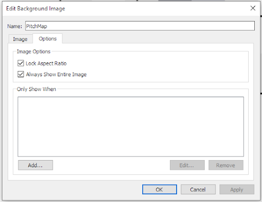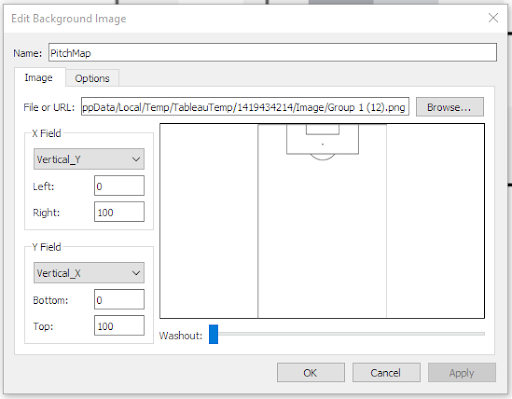 I imported a background image by going into the Map tab in Tableau and added an image of a football pitch outline. You can play around with the options depending on what type of image you used but here is how I set mine up. Again, the image can be found in the repository at the top of the page to download.