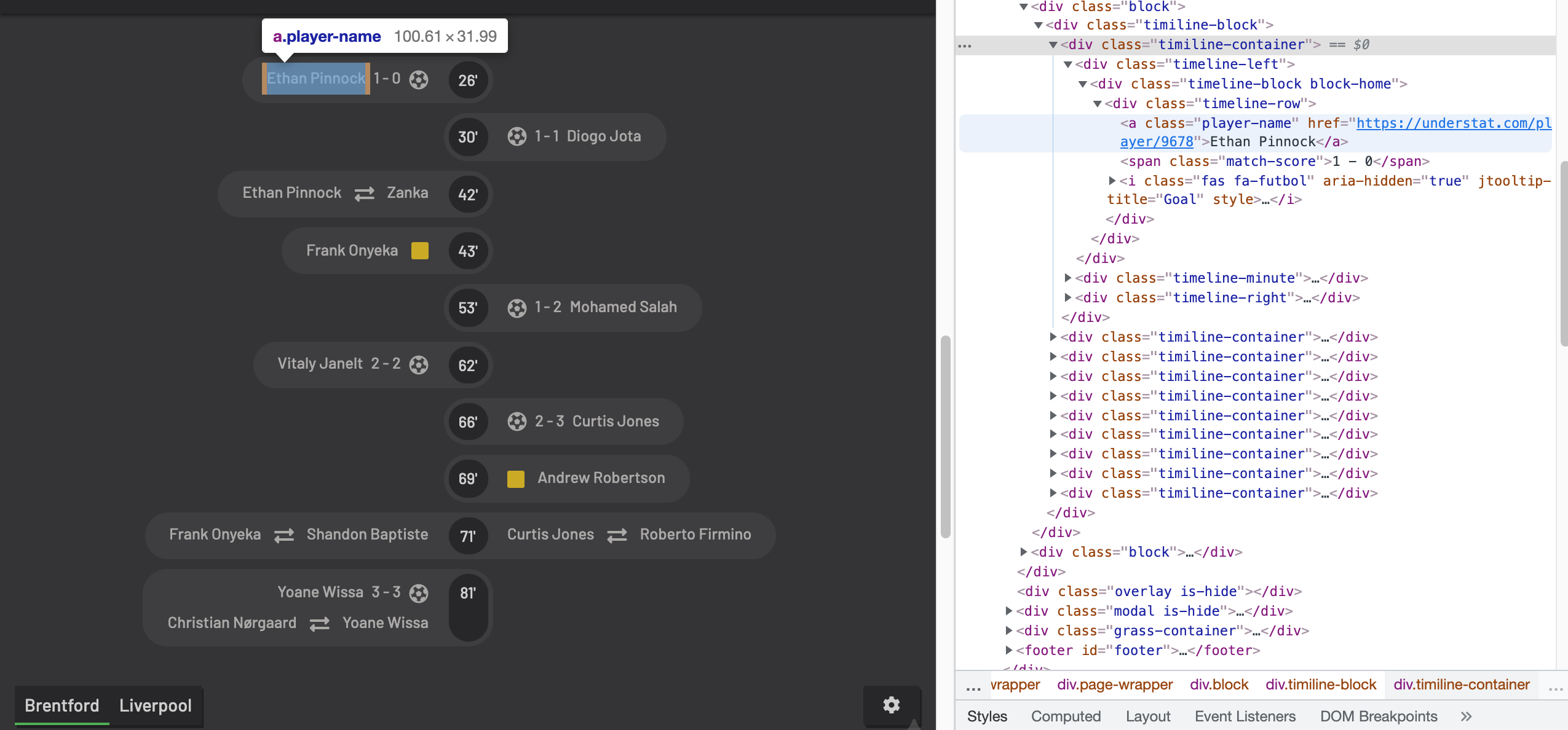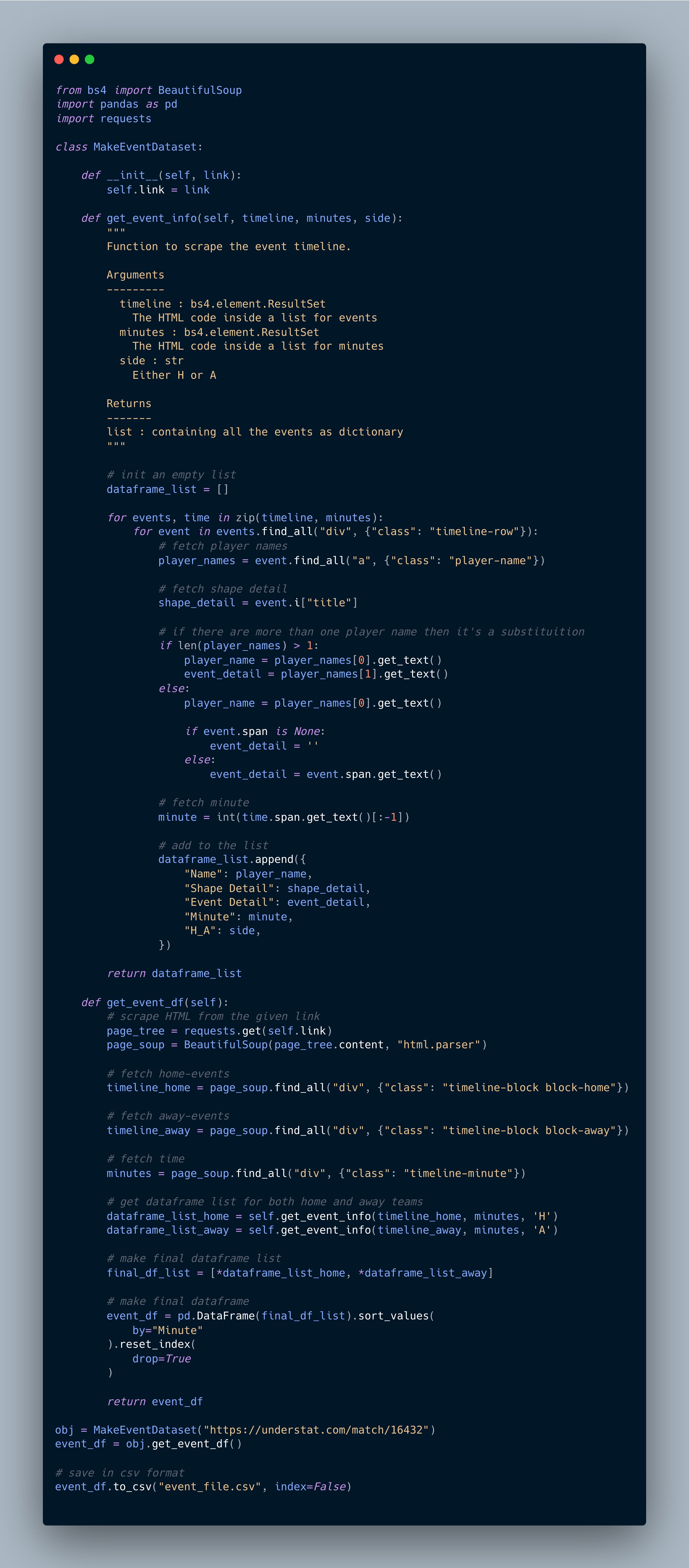 Beautiful Soup is a Python library for pulling data out of HTML and XML files. It is a way of navigating, searching and modifying the parse tree. We can use it in relation to the Understat by inspecting the website page and finding the components we want to construct our dataset.