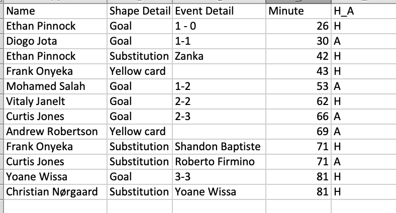 - The Event detail if it has the goal scoreline in, you will want to make sure it doesn't revert to showing a date format. (I.e 1-1 accidentally showing as 1st Jan)