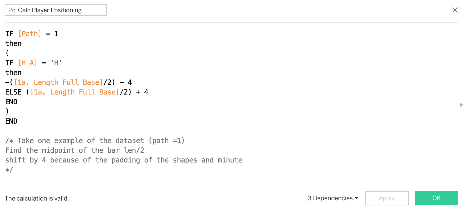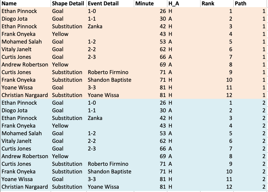 Explanation: So by duplicating our dataset we can create two points of reference. Taking the first goal for example. We will create a point on the x axis at zero (path =2) and also a point leftwards of this mark that equals the length of our previous calculation. (path = 1)