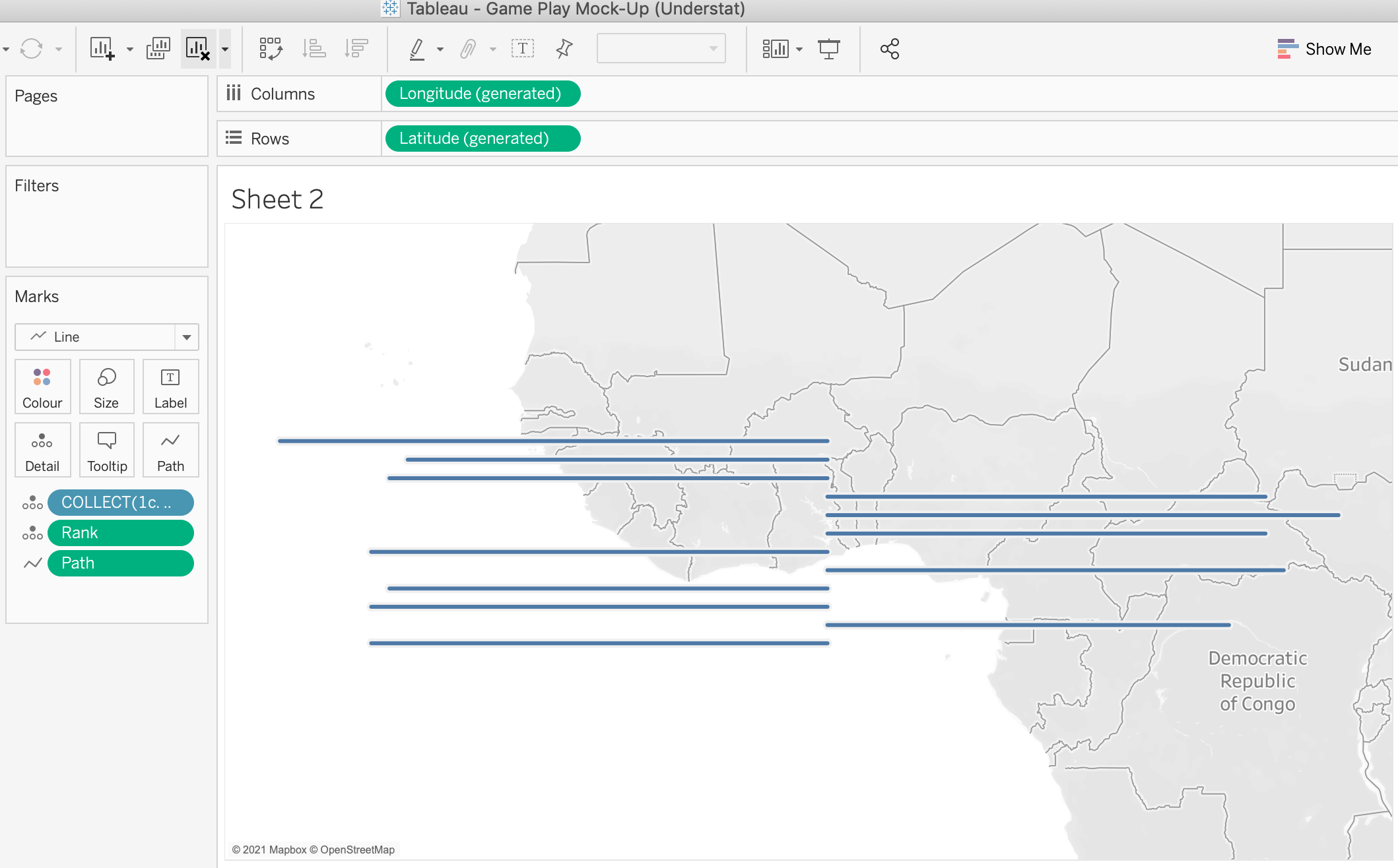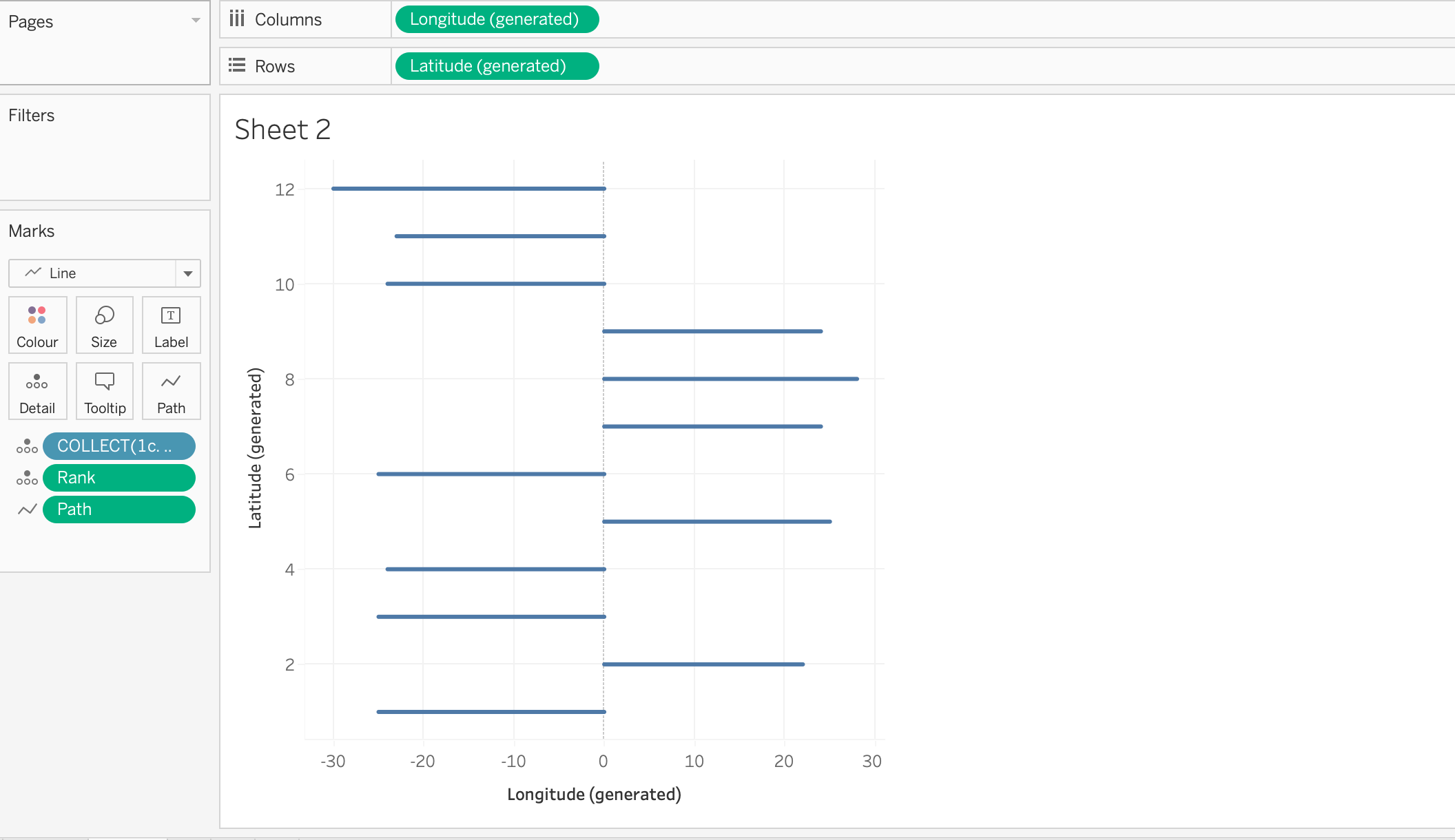 - Change the Marks to a line, drag rank and path onto detail making sure they are dimension.