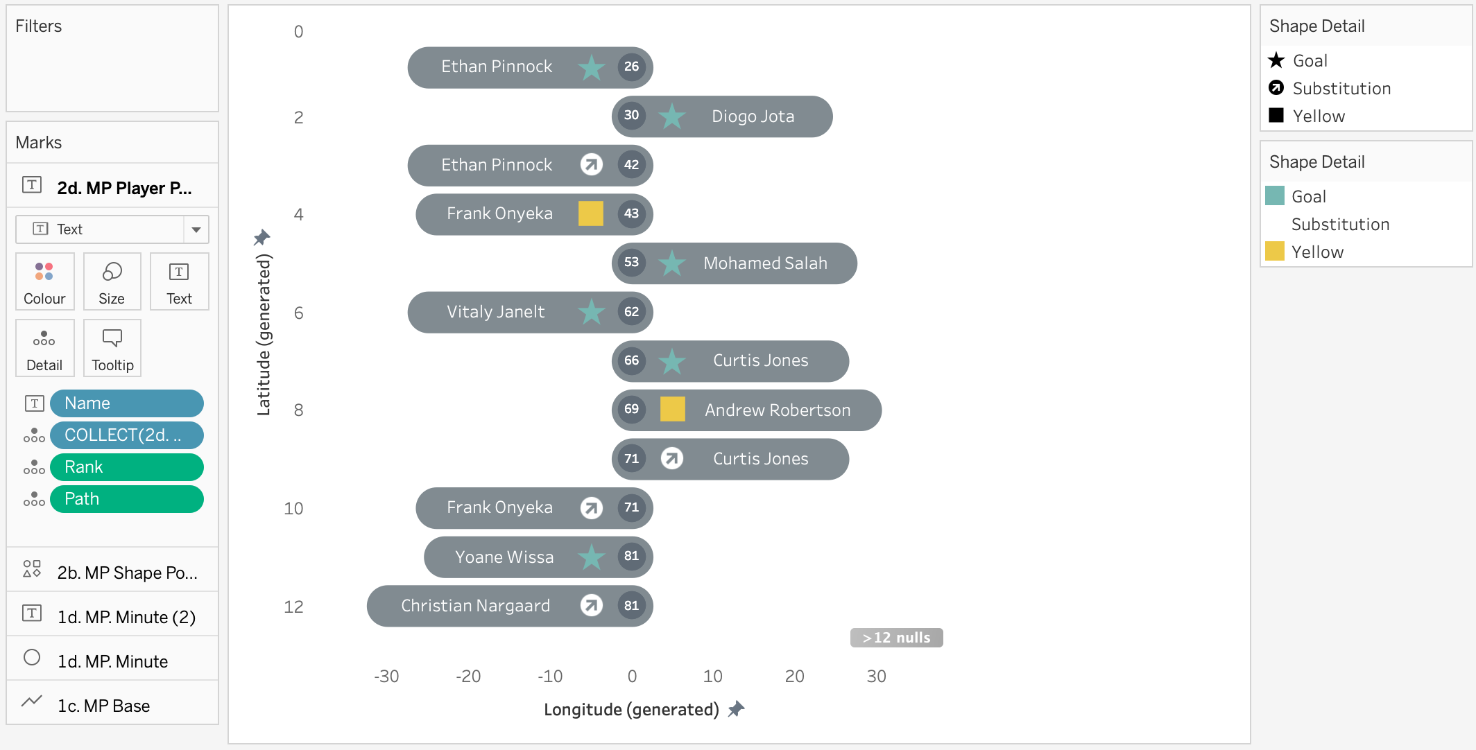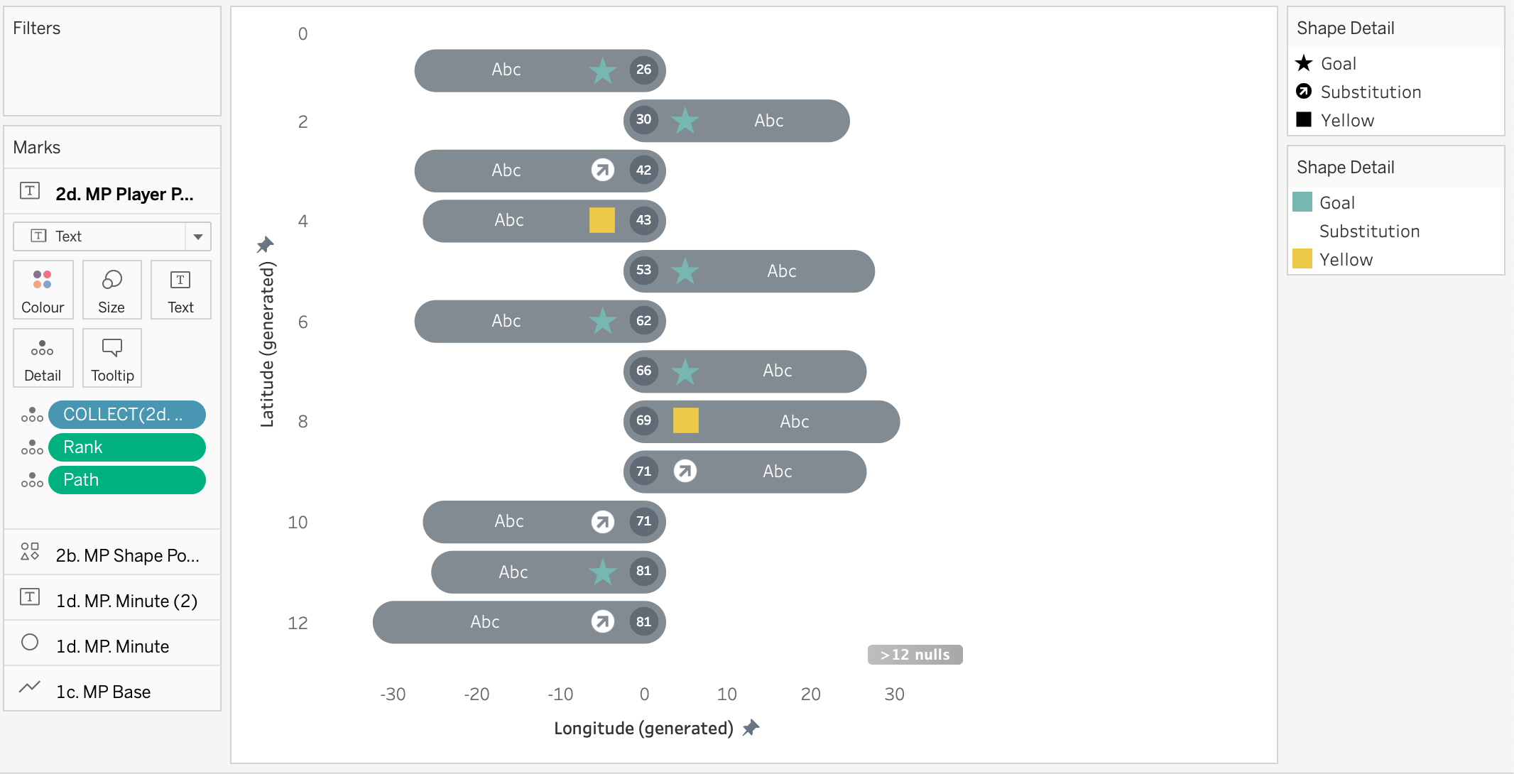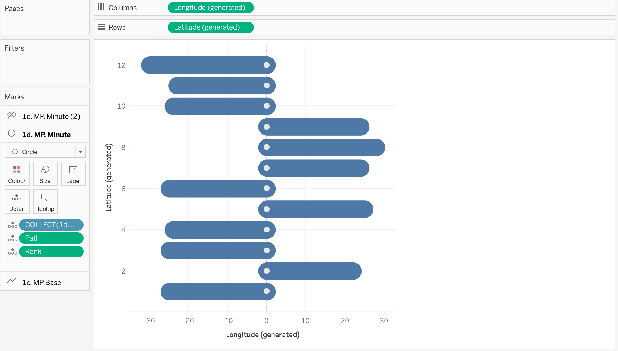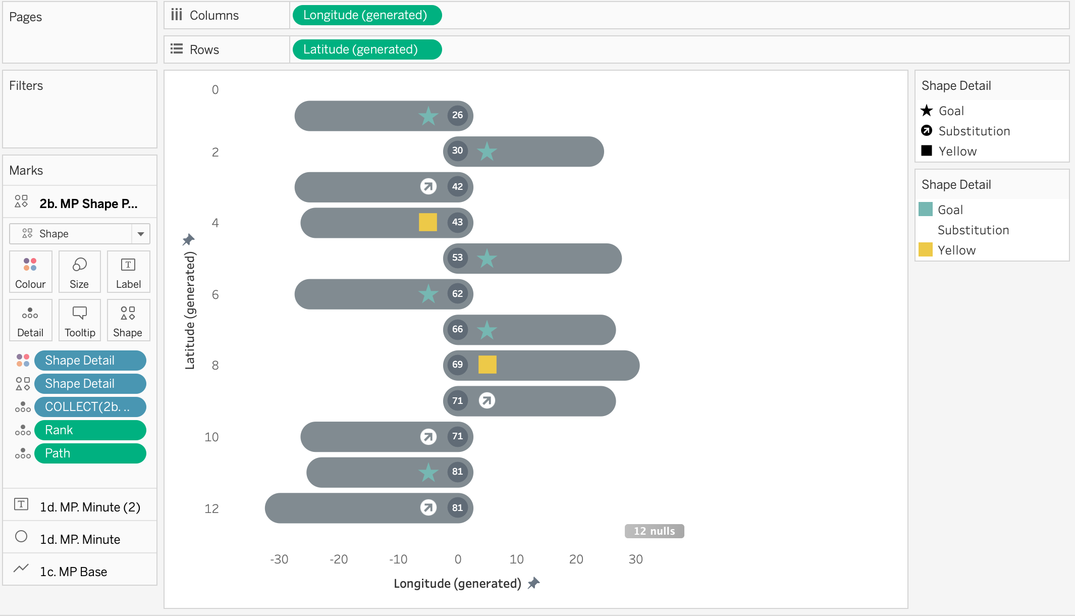 - Go to the first of the two marks for 1d. MP Minute and change it to a circle, Resize the circle as appropriate and amend the colour as you like. You will need to drag Path and Rank onto the marks card as dimensions.