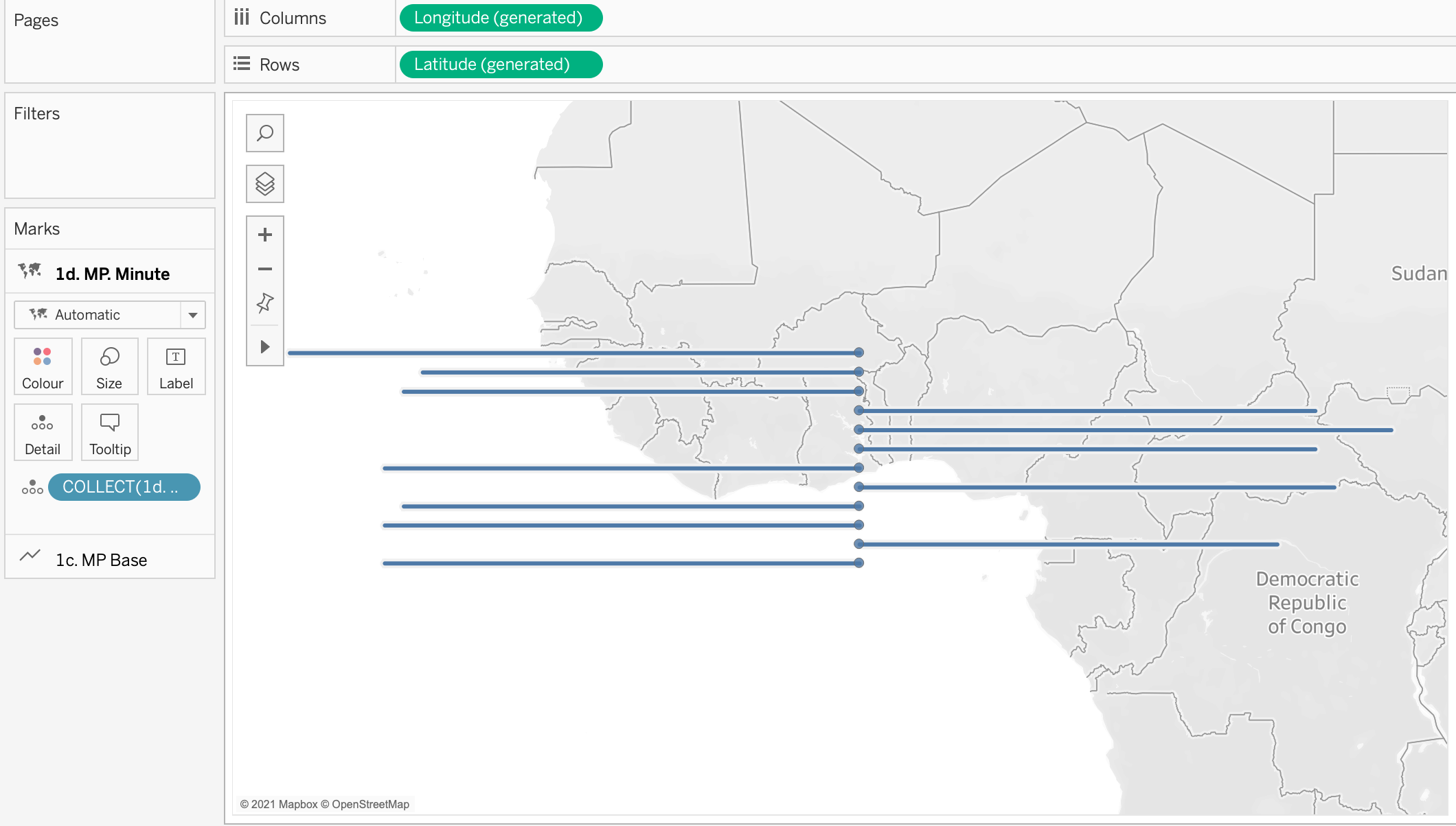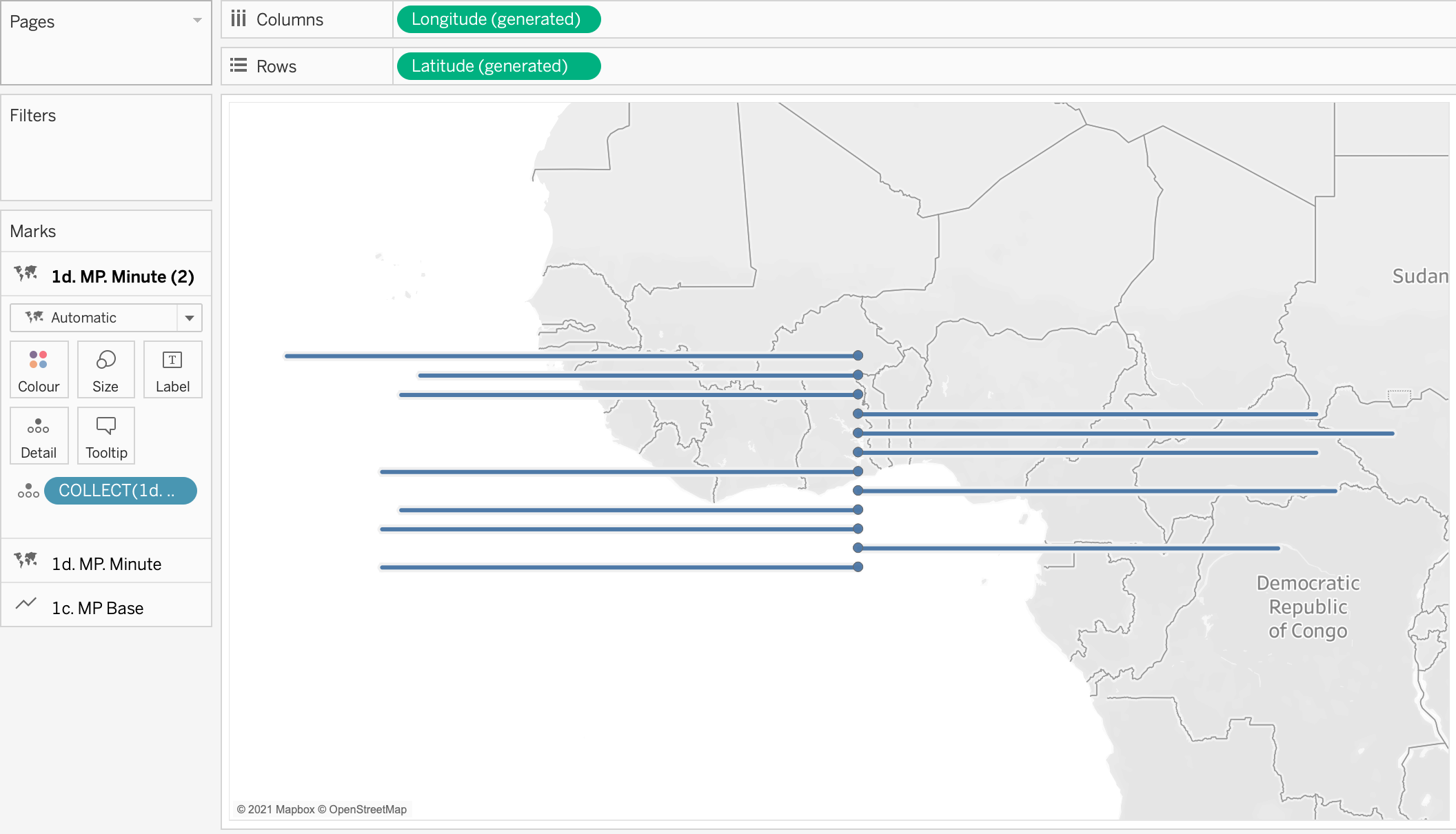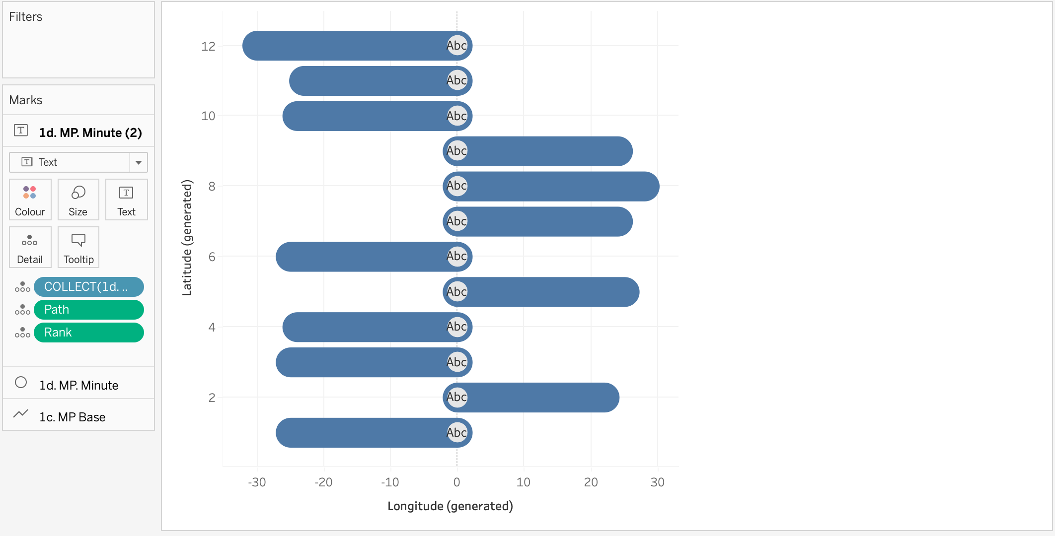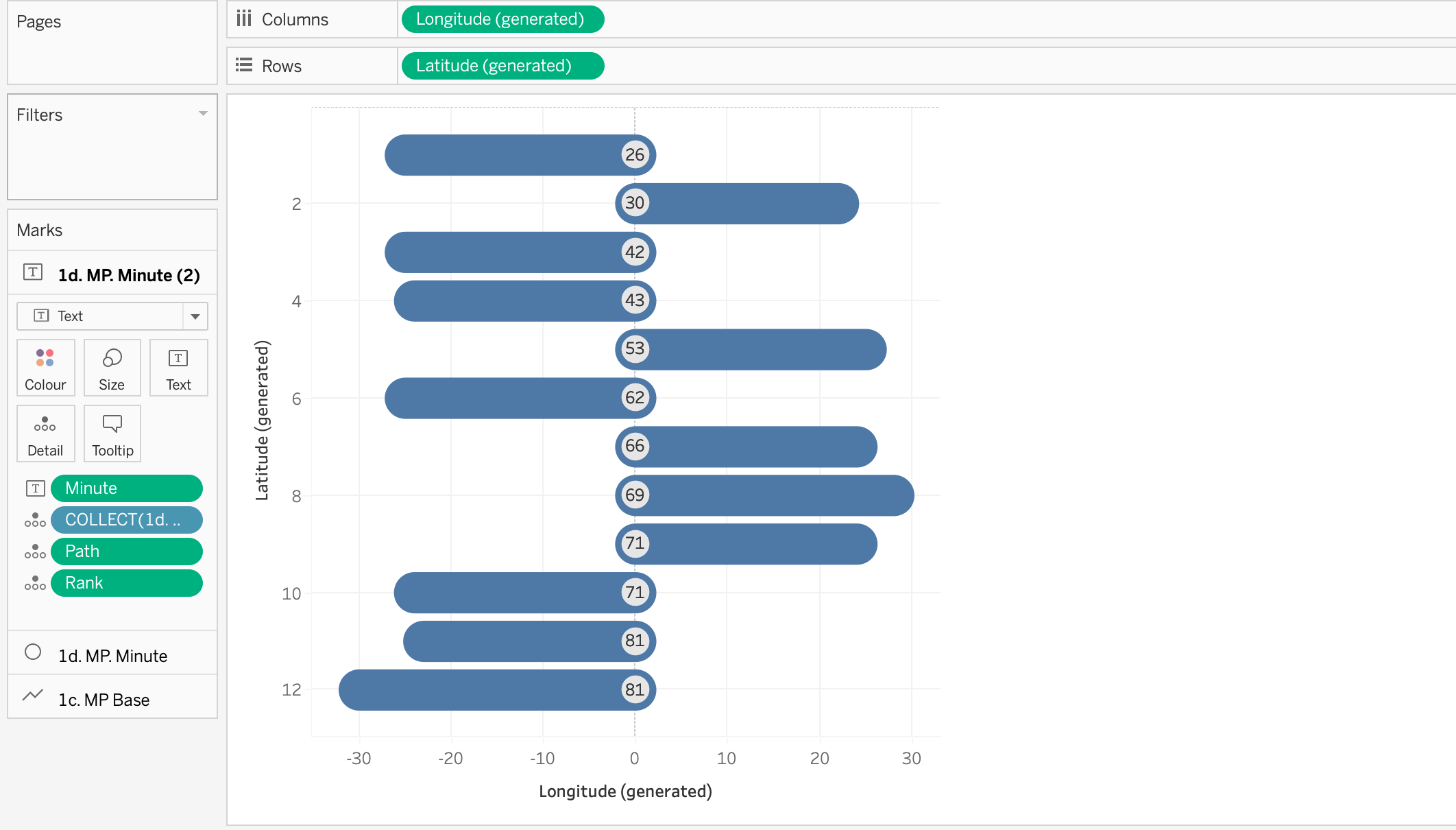 - Go to the first of the two marks for 1d. MP Minute and change it to a circle, Resize the circle as appropriate and amend the colour as you like. You will need to drag Path and Rank onto the marks card as dimensions.