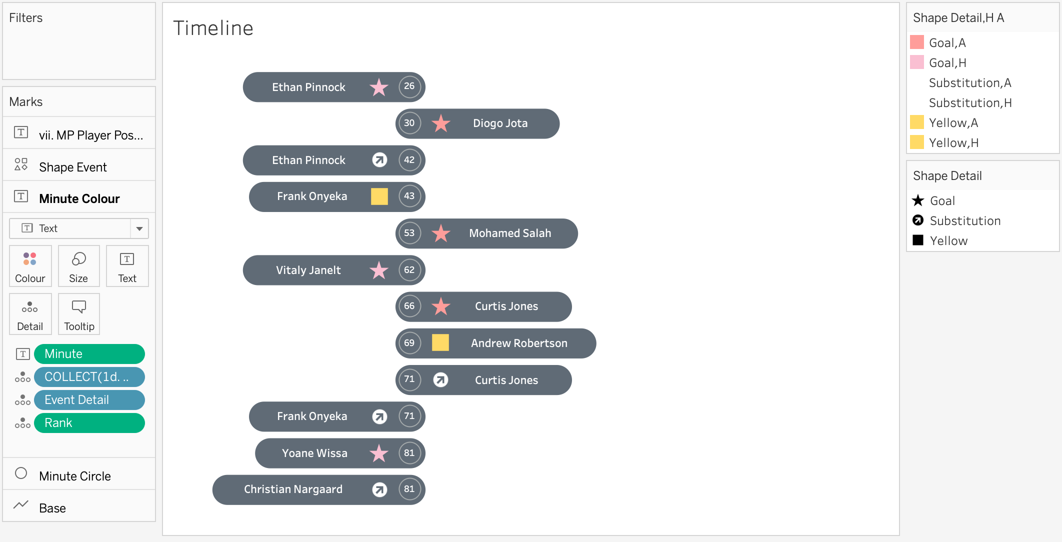 You may at this point want create custom shapes based on the event. Drag Shape Detail onto the shape as well as colour. Here is an example using the Tableau built in colour and shapes. Feel free to use your own shapes as necessary.