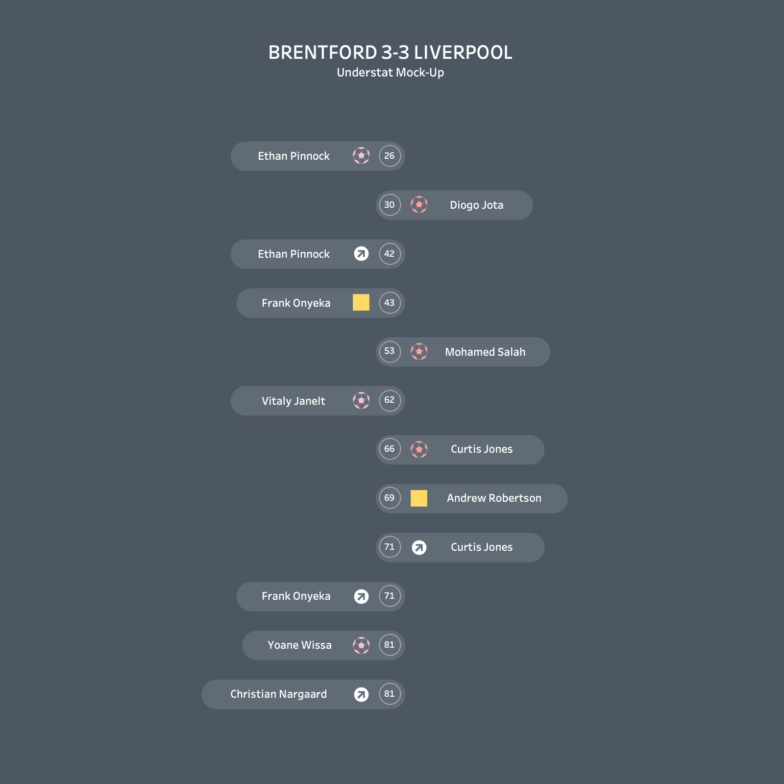 We will be looking to recreate the Understat website user interface for a specific match. Here is the Understat website version. Below is what we will look to create within Tableau. You can find the workbook in the link at the top of the page.