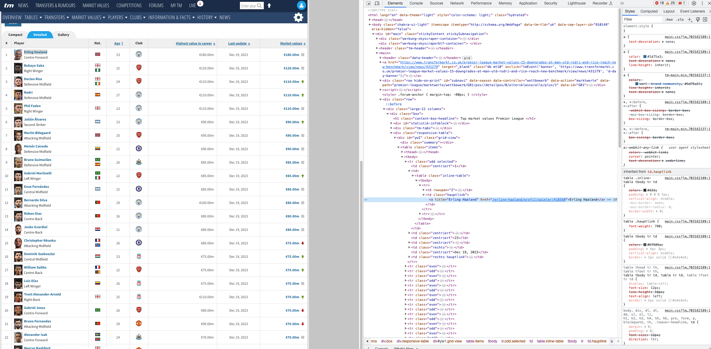 You will see the different tagging available in the web page. Notice the highlighted title of Erling Haaland. Essentially we have to navigate through these different trees to find the different attributes we want.