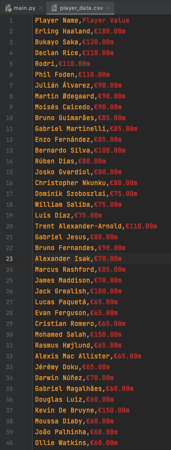 This Python script is a web scraper that extracts information about player names and their corresponding values from the Transfermarkt website, specifically focusing on the Premier League. The script utilizes the requests library to send HTTP requests and the BeautifulSoup library to parse and navigate HTML content. The extracted data is then organised into a pandas DataFrame and exported to a CSV file.