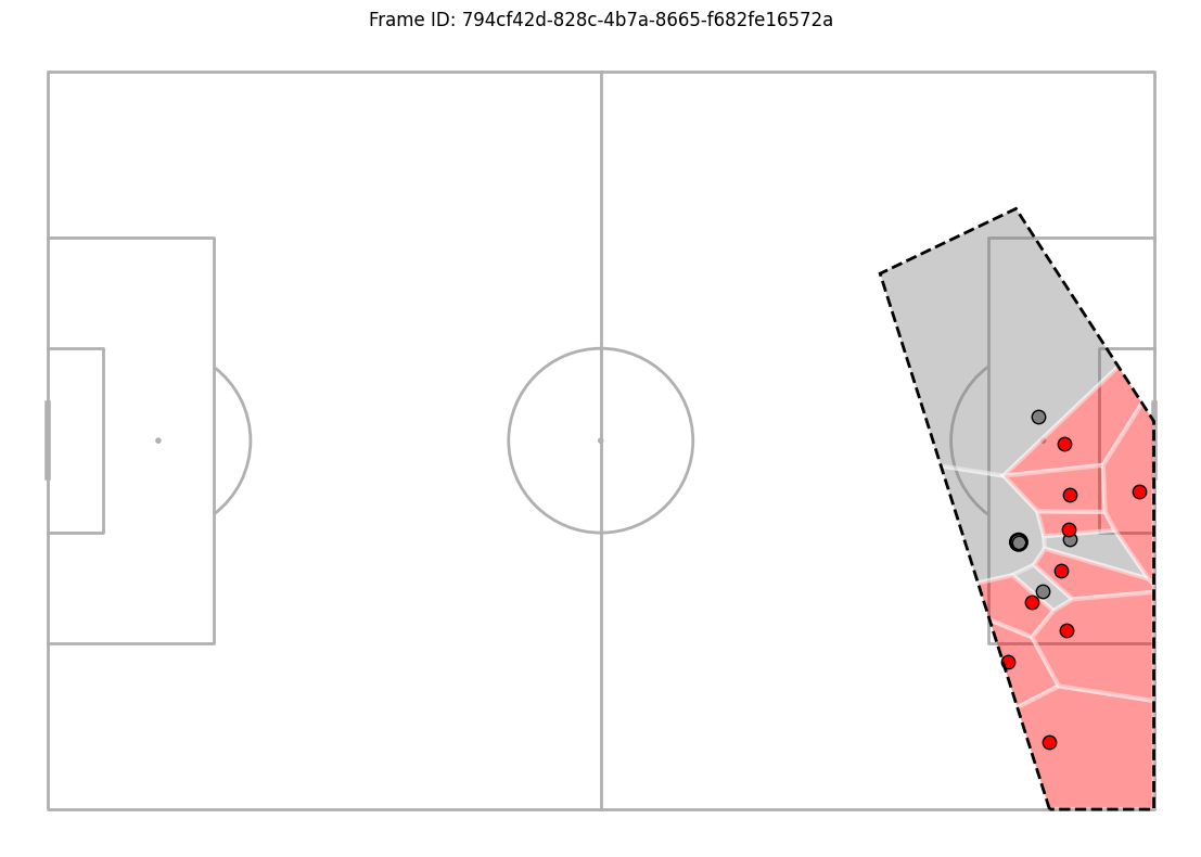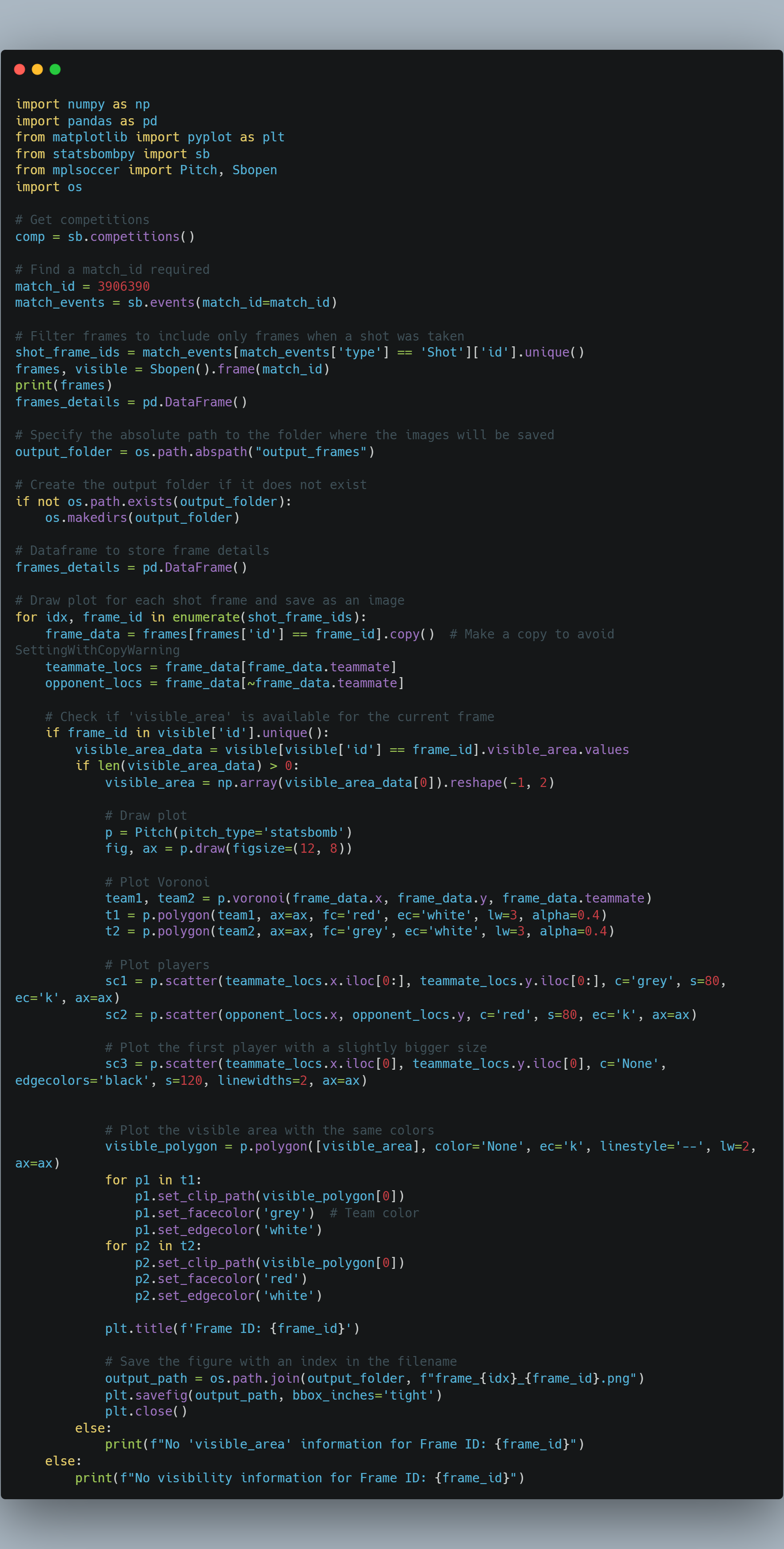 Overall, this code generates individual frames for each shot event in a match, plots the players' positions, visible area, and Voronoi polygons, and saves the frames as images in a specified output folder.