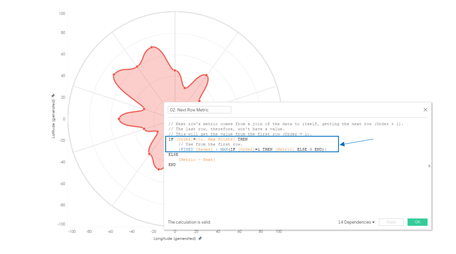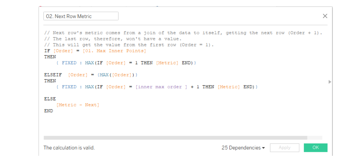 Next, I adjusted the calculated field 02. Next Row Metric