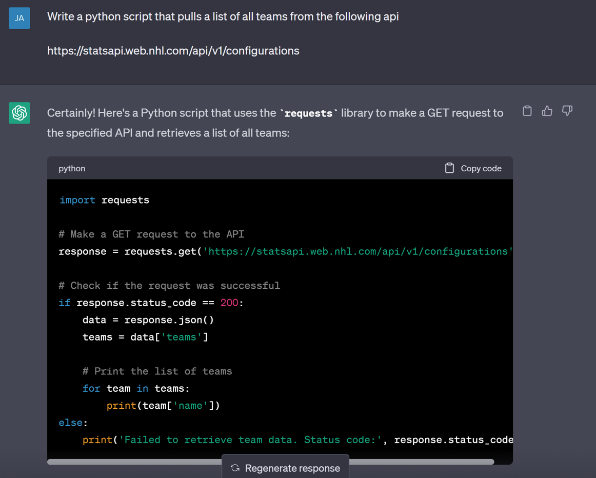 Hi all, It's a delight to be able to welcome Jared Flores onto the blog today. Jared is in fact the first person to make multiple guest appearances on the site! Pretty good going huh. Of course, when I'm not convincing Jared to write content to host on this channel you can find him on his own Youtube, Tableau Public, website and Twitter. Jared will look to cover off using Tableau Prep, ChatGPT, and Python to create an interactive and in-depth Tableau Dashboard around your favorite NHL stars. The blog will be split into two sections. The first using ChatGPT to help with coding. The second will look at data cleansing and Tableau. All code and files as usual can be found through the Github link! Over to Jared for todays content.ChatGPT has been all the buzz lately. From writing quirky jokes to negotiating lower prices with customer service chats, there have been so many use cases uncovered since it’s public release. A few months ago, I wanted to see if I could use it to assist me in writing some Python to pull data from the NHL’s public API so I could create a dashboard with the data. The process has evolved over time but the results were amazing. I’m going to show you from beginning to end what it took to create the NHL Player Stats Dashboard.