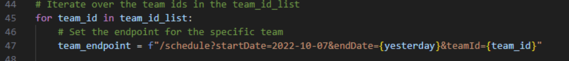 Next, we use these team IDs to fetch the games each team has played since a specific date. We construct the URL for the endpoint using the base URL, the date range, and the team ID.