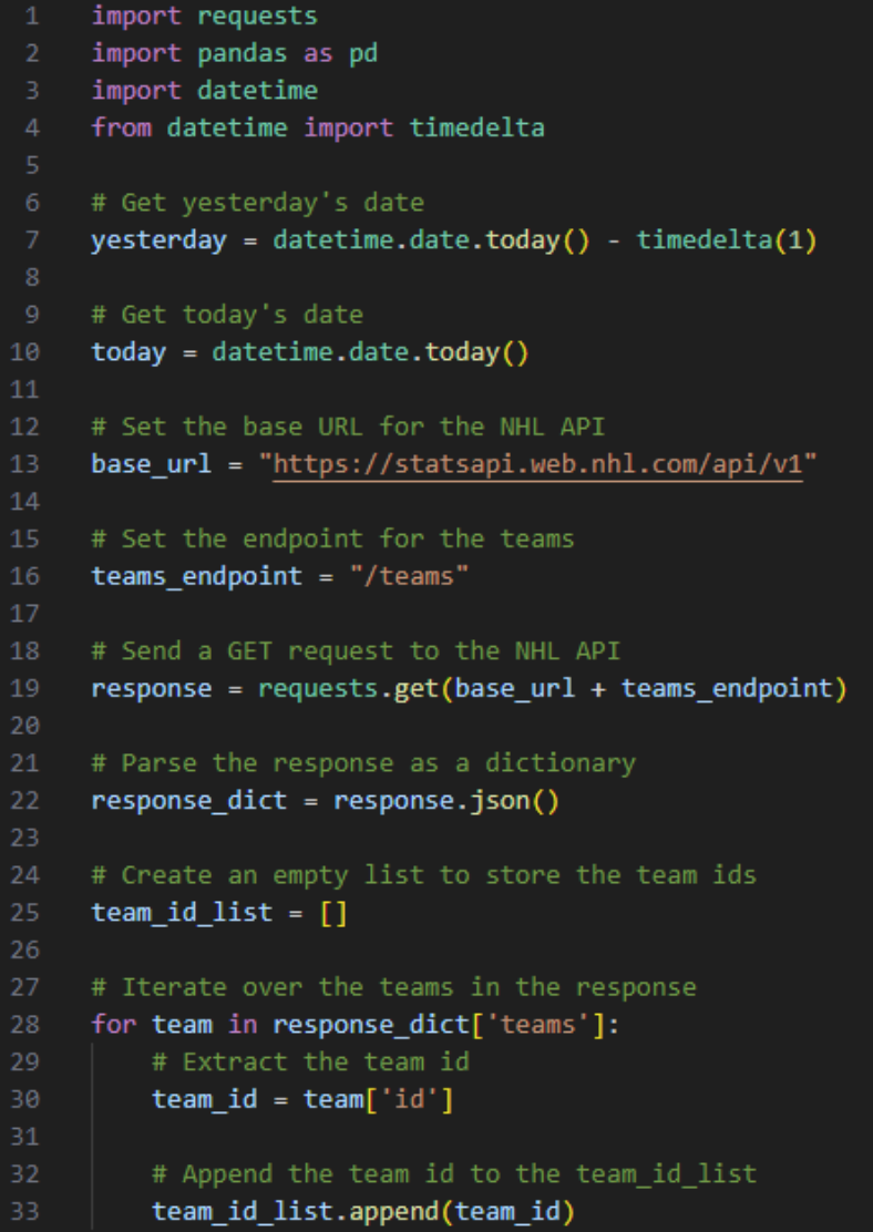 Firstly, we get the team IDs. The base URL for the NHL API is https://statsapi.web.nhl.com/api/v1. We then append /teams to this URL to get the endpoint for teams. Using the requests.get() function, we make a GET request to this endpoint, parse the JSON response into a Python dictionary, and extract the team IDs.