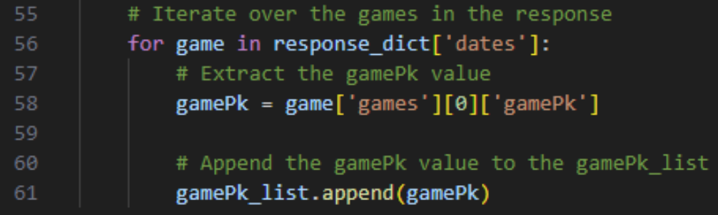 For each team, we extract the gamePk values, which are unique identifiers for each game.