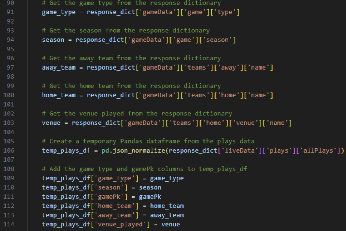 Using the gamePk values, we then fetch the detailed data for each game. This includes information about the game type, season, teams, venue, and plays. We extract the data we're interested in and store it in a temporary Pandas DataFrame.