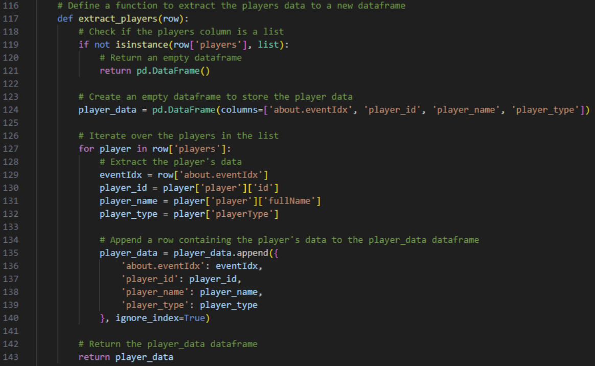 An additional layer of complexity is the player data nested within each play. We define a function extract_players to handle this. The function checks if the players column is a list, and if so, creates a DataFrame to store the player data. It then iterates over the players in the list, extracts the player's data, and appends it to the DataFrame.