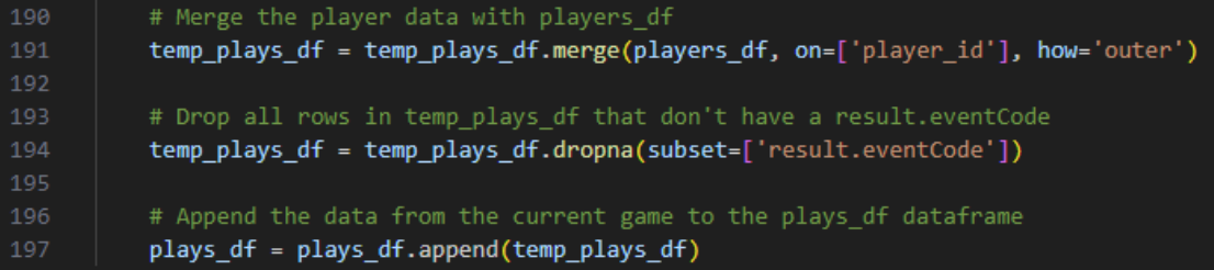 Next, we merge our play-by-play data with player data and clean it up, dropping rows without a result.eventCode. We then append this cleaned data to our main DataFrame, which stores data from all games.